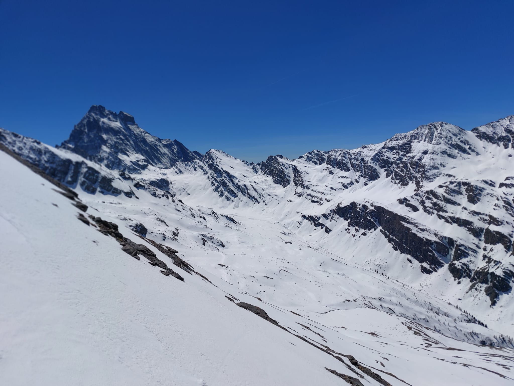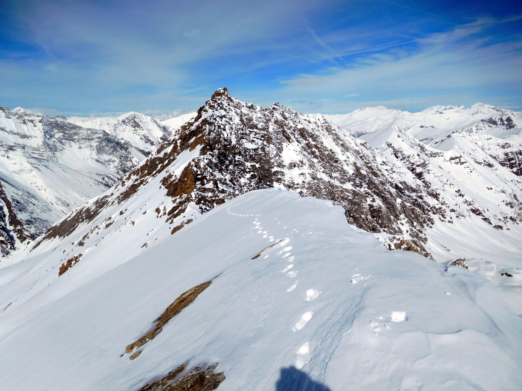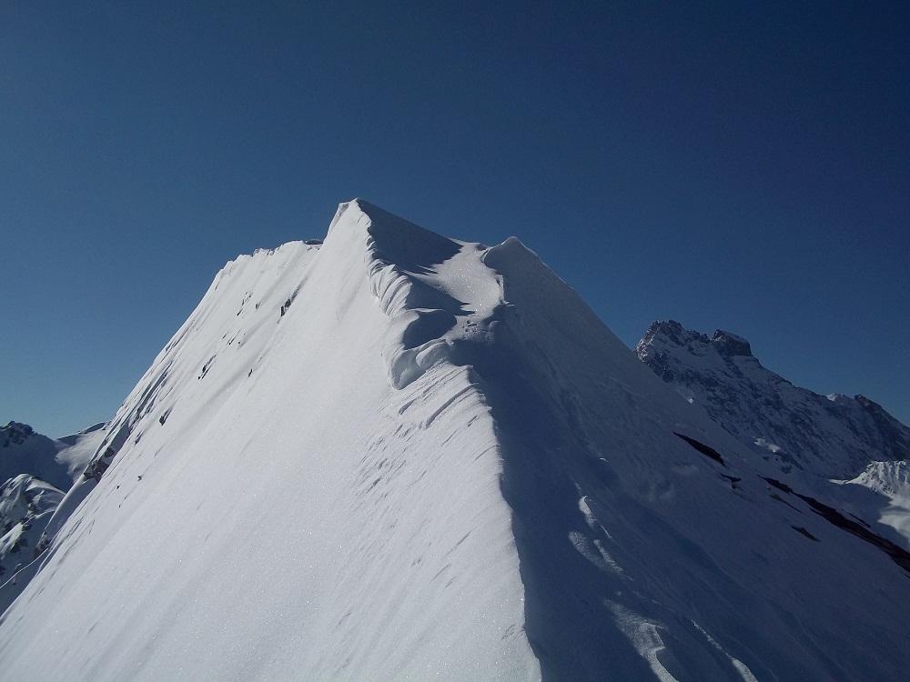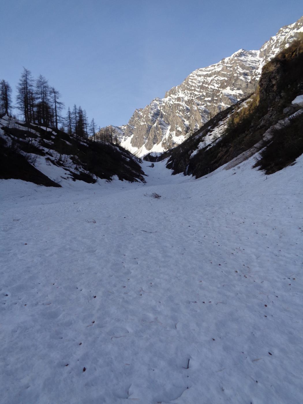 Da qui riprendere sempre l’ampio canalone alla base delle ripide pareti che lo chiudono sulla dx e continuare in direzione dell’evidente colle. Dal colle seguendo la dorsale verso sx (est) in pochi minuti si raggiunge l’arrotondata vetta della Schina d’Asu.