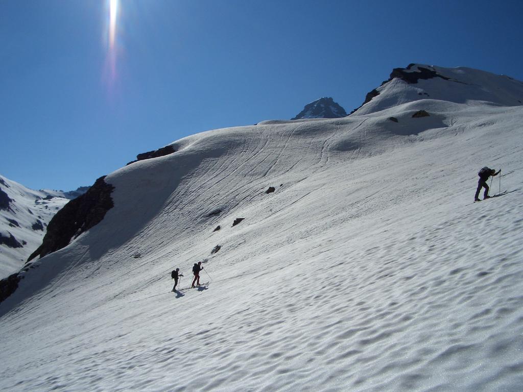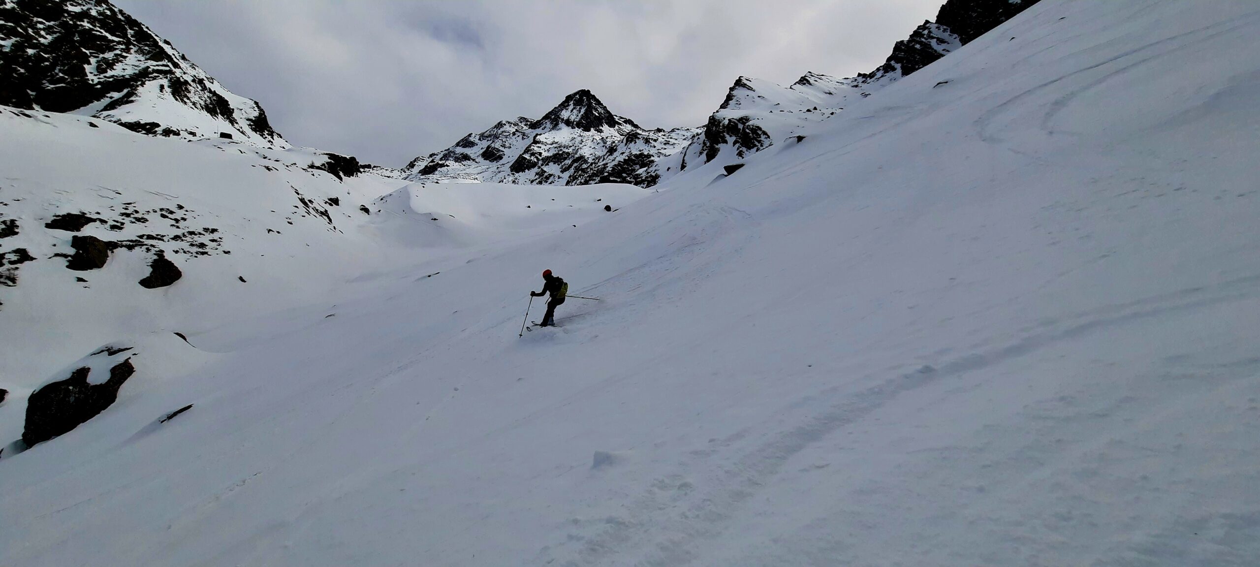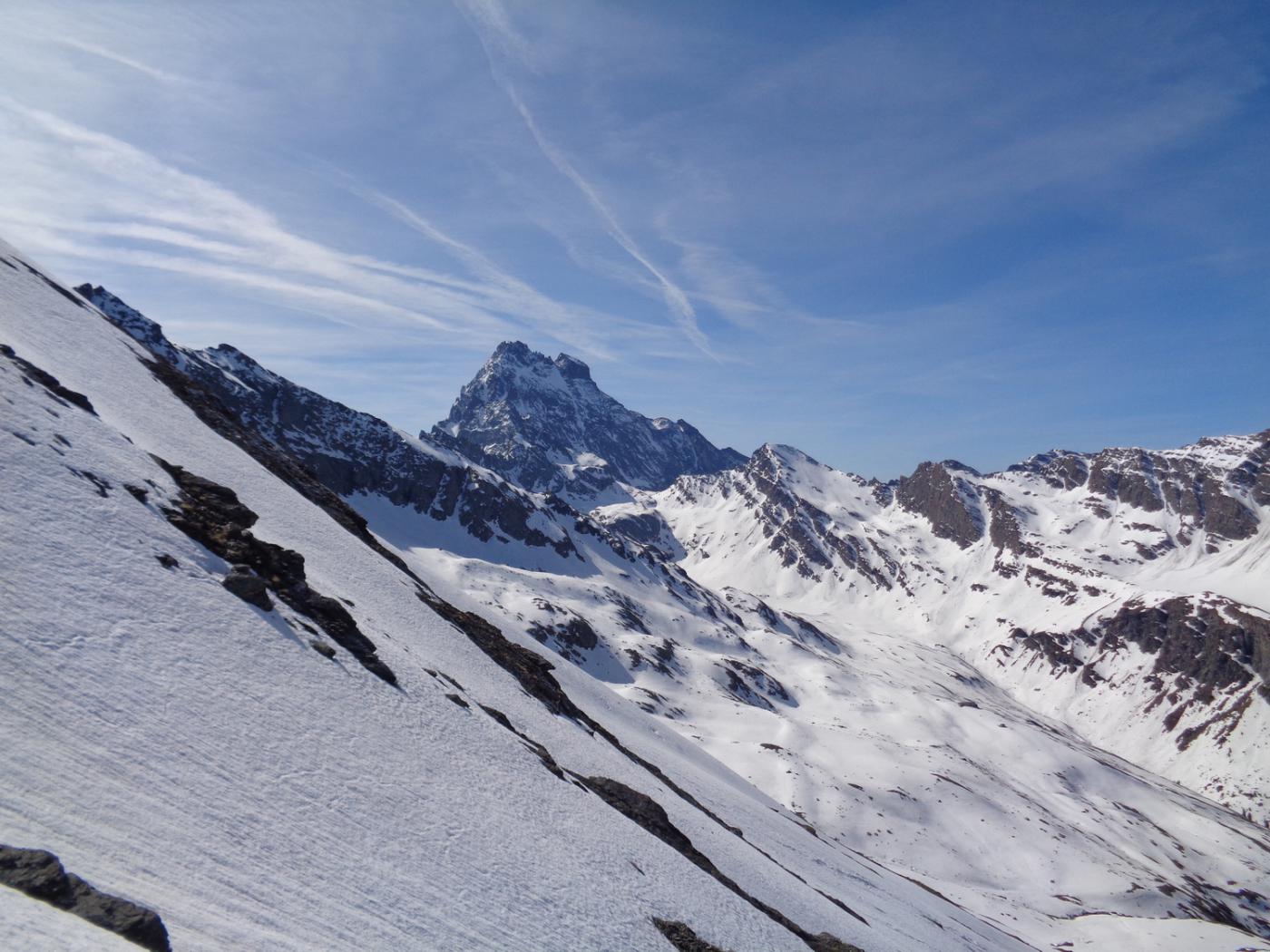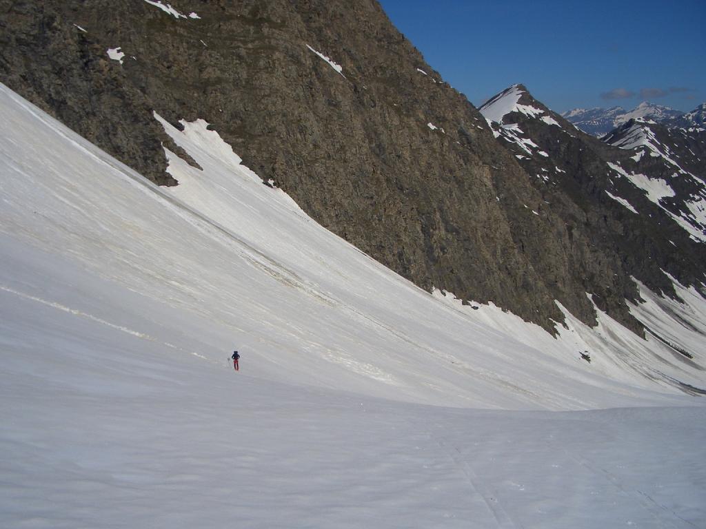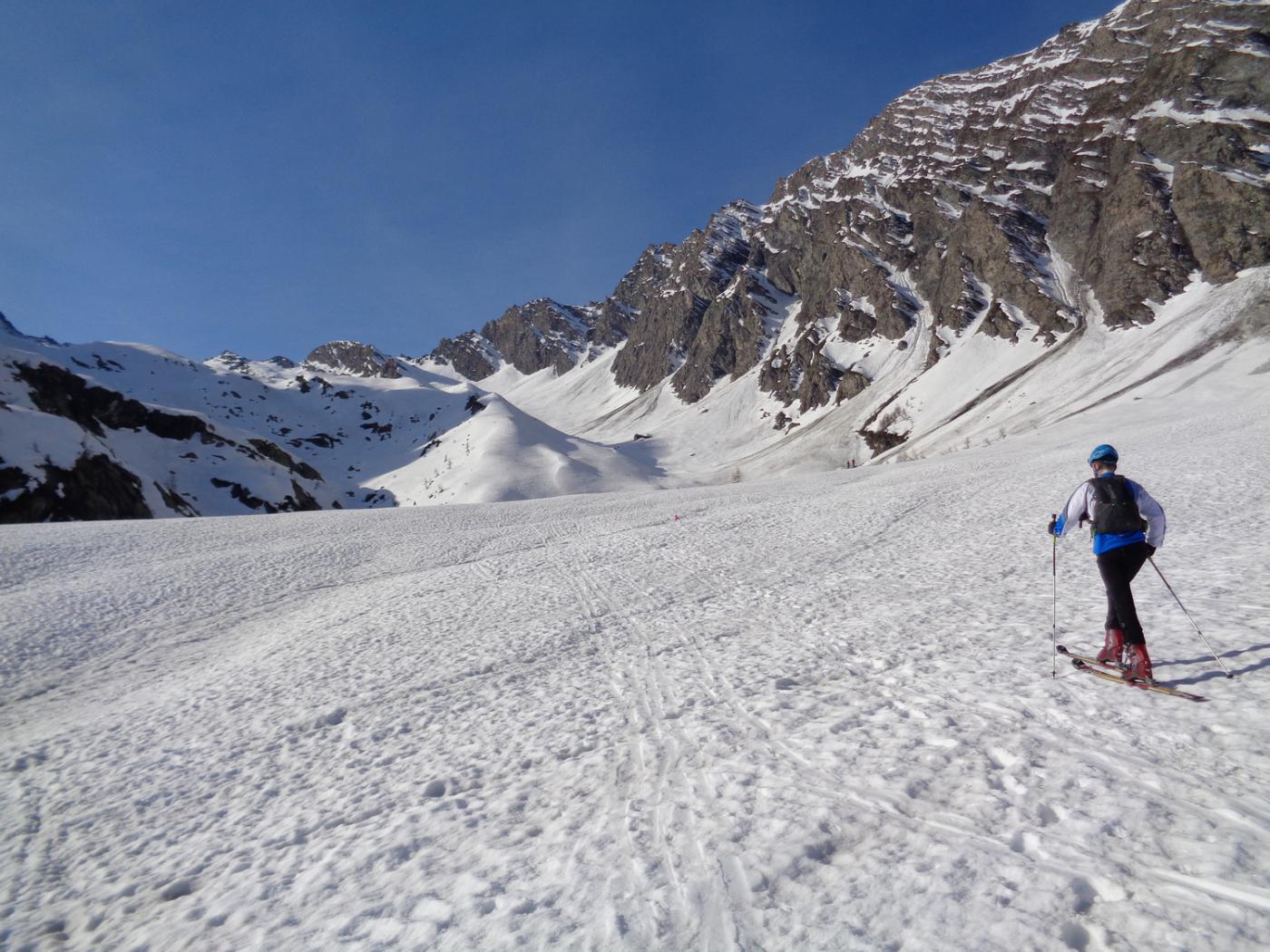 Da qui riprendere sempre l’ampio canalone alla base delle ripide pareti che lo chiudono sulla dx e continuare in direzione dell’evidente colle. Dal colle seguendo la dorsale verso sx (est) in pochi minuti si raggiunge l’arrotondata vetta della Schina d’Asu.