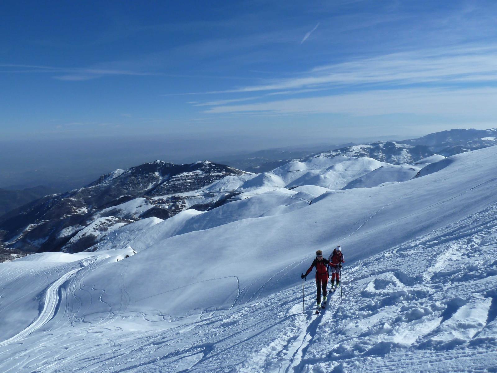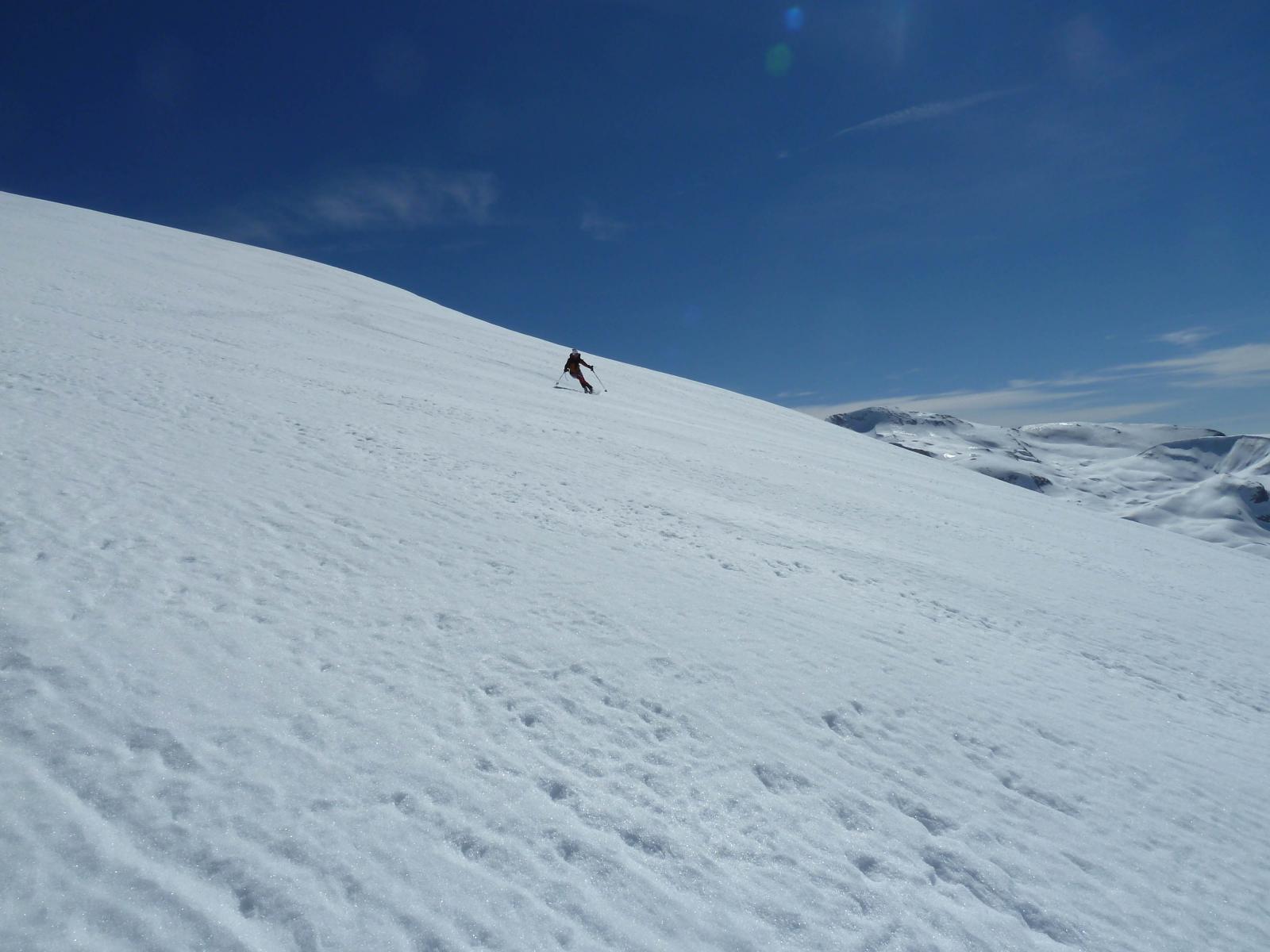 Oggi uscita sulle montagne di casa causa impegni di lavoro per Renato. Partenza da Artesina in compagnia della nostra cara amica Stefania sulle piste ancora chiuse e passando per Colla Bauzano raggiunta comodamente la cima del Mondolè. Qui ci dividiamo, Renato scende verso Artesina mentre io e Stefi scendiamo sul versante sud su bella neve portante per poi proseguire in direzione del Seirasso. Salita x la colletta del Seirasso nel valloncello tra la Rocca dell’Inferno e la Cima Seirasso su traccia appena fatta da 2 amici garisti. Discesa su crosta portante sul costone terminale poi nel vallone tenendo le expo in ombra ancora bei tratti di farina stagionata altrove piuttosto marcetta. Ripellato e per evitare il traverso per colla Bauzano abbiamo preferito seguire un’invitante traccia che ci ha riportato nuovamente sul Mondolè con finale alpinistico. Discesa sul costone ovest su neve già cotta dal sole ma ancora sciabile e ritorno ad Artesina su piste battute.Dislivello effettivo m.1900.