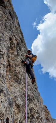 - L2: Traverso delicato di un paio di metri a sx, poi in verticale su muro a buchi e tacche (6b) poi più facilmente per alcuni metri verso sx e ancora un passo delicato per uscire in sosta (6b)