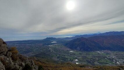 Diedro di 4(5c) sempre ostico con roccia liscia e un po’ aggettante, faticoso.