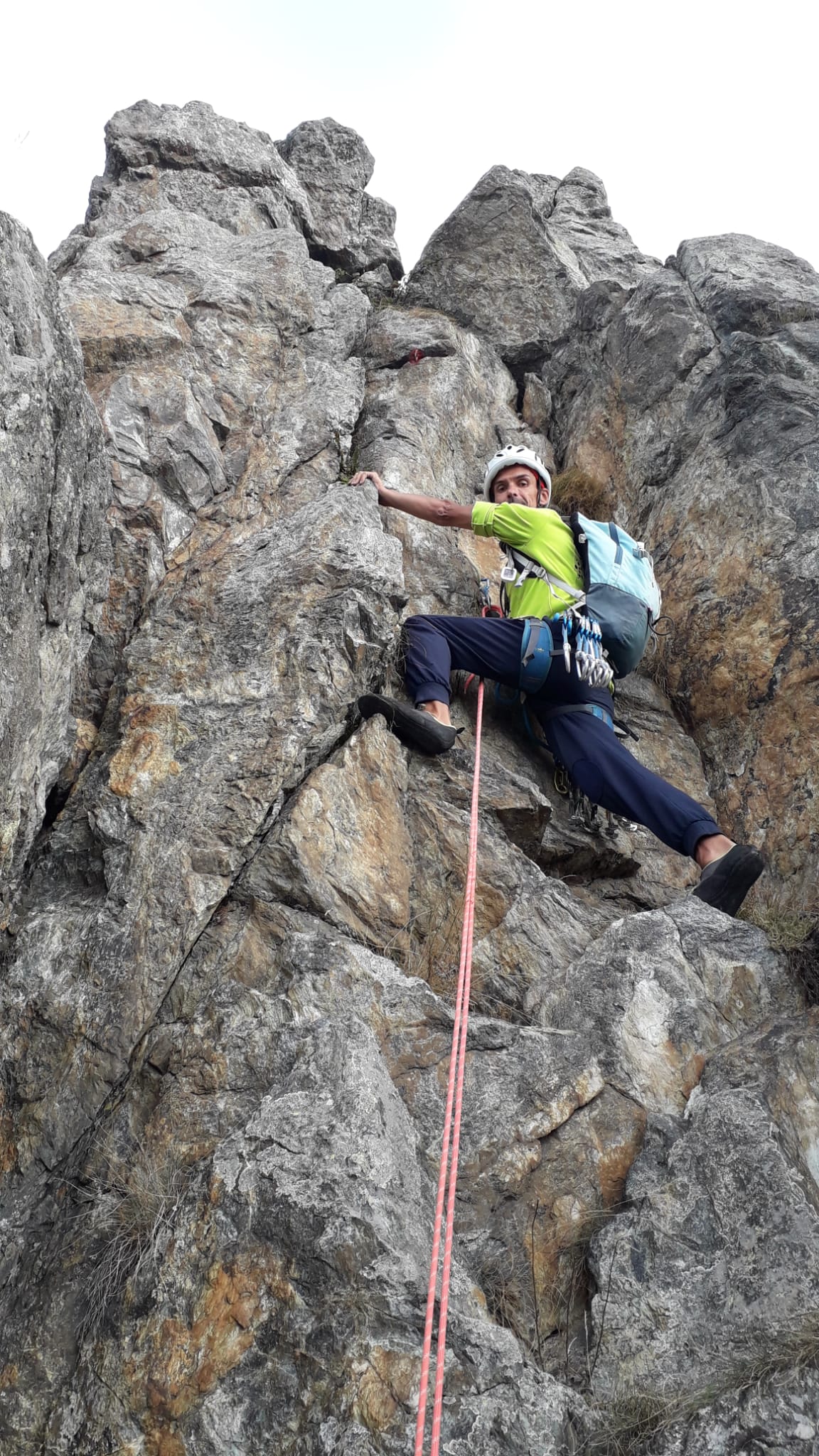 Al socio l’onore e onere di salirla quasi per intero da primo. Ostico ancor piu’ che un tempo il superamento del passo chiave al torrione San Bernardo, che continuo a credere sia ben piu’ che un quarto, e dove il socio non ha avuto vita facile nel venirne a capo. Sono pochi metri ma decisamente cattivi. Dal canto mio mi sono tolto il fastidio evitandolo sulla sx e non me ne vergogno affatto.