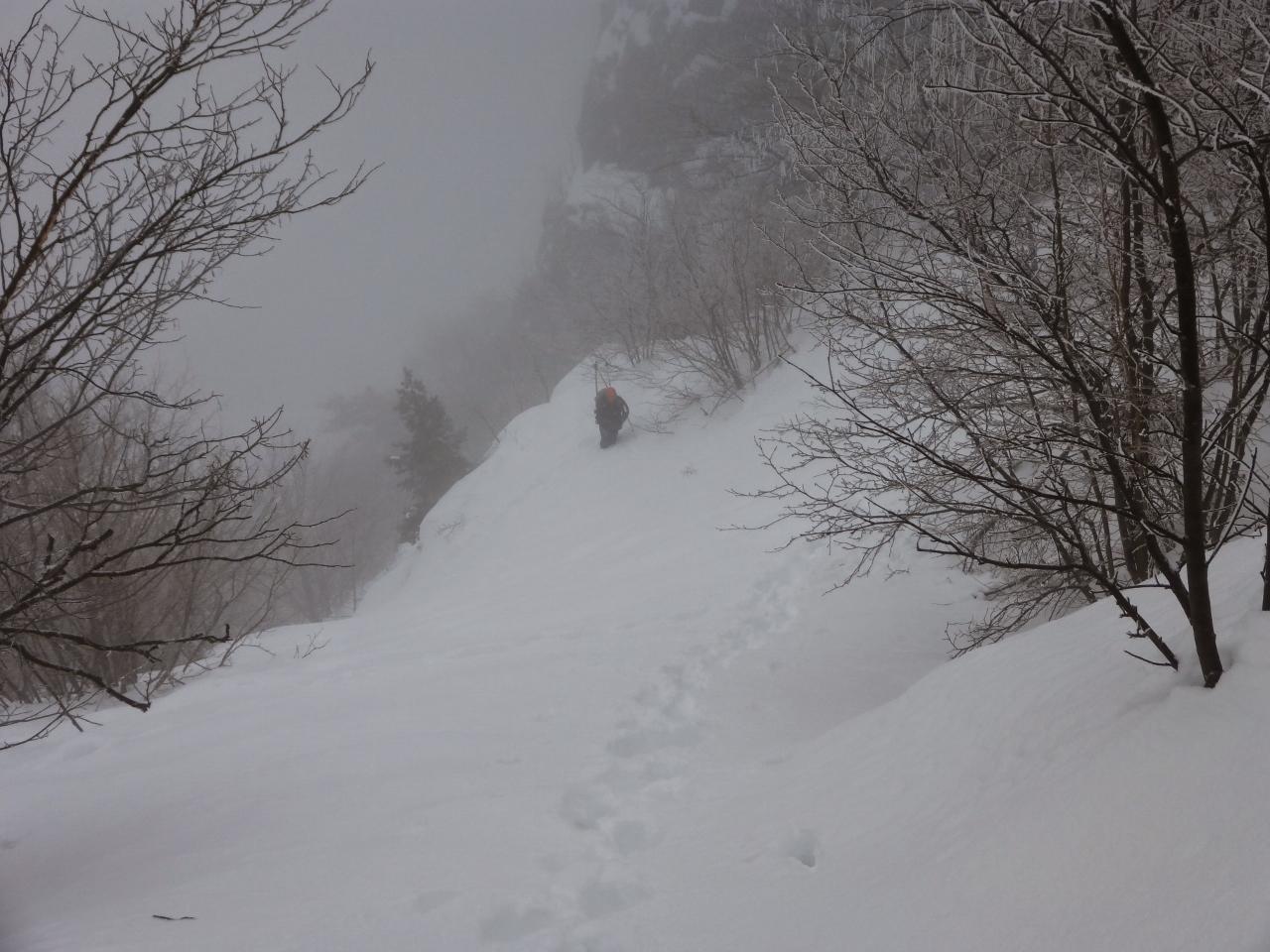 – canalone N-E parte: larghezza sui 20-30mt con spazio “sciabile” largo dai 5 ai 15mt in funzione della boschina e di alcuni risalti rocciosi. Brevi tratti sui 40°. Uscita consigliabile (logica) sulla cresta che separa la cima N (Lapide Bosio) dal vicino sentiero Tramontana, che si raggiunge scendendo di 15/20 mt sul versante S. Si può anche uscire in direzione della sella tra la cima Ovest (Madonnina) e quella E, ma si deve percorrere un’esile cengia che con la neve risulta impegnativa.
