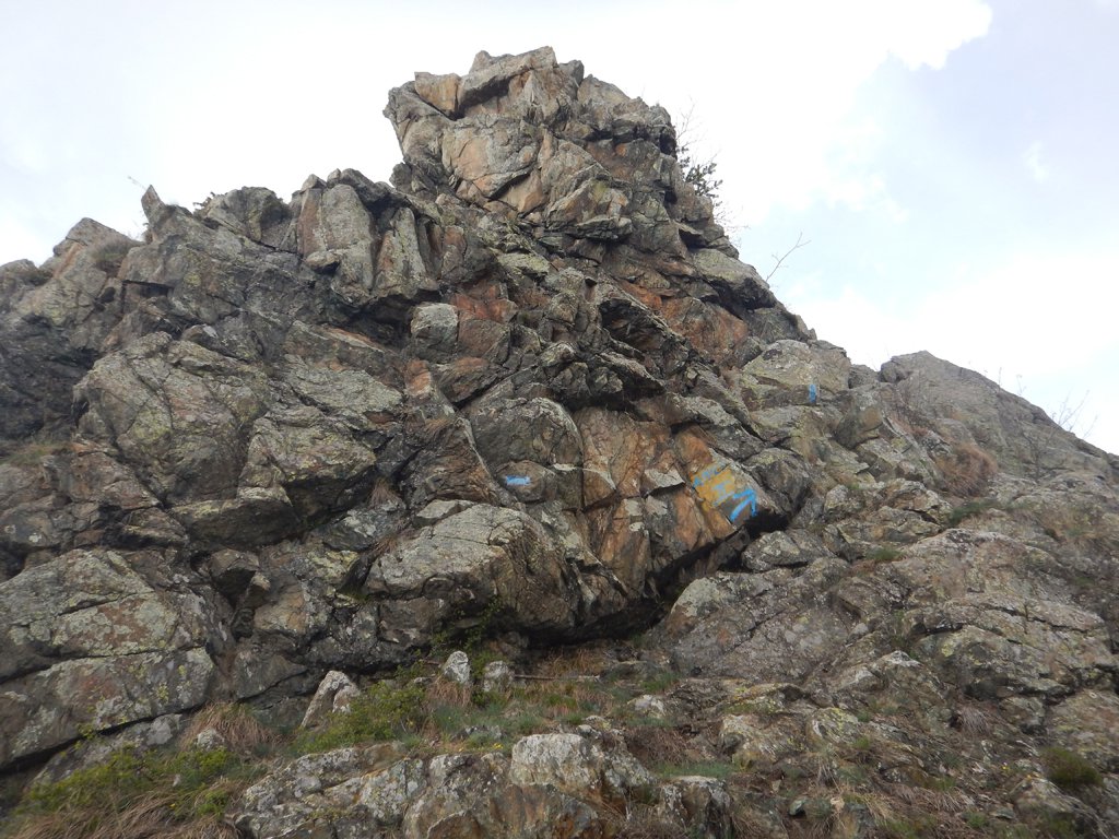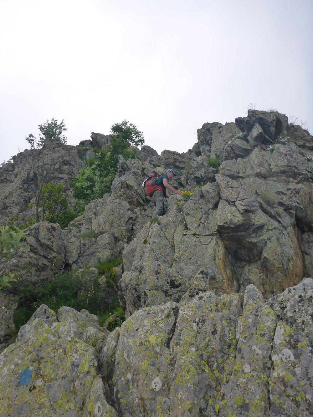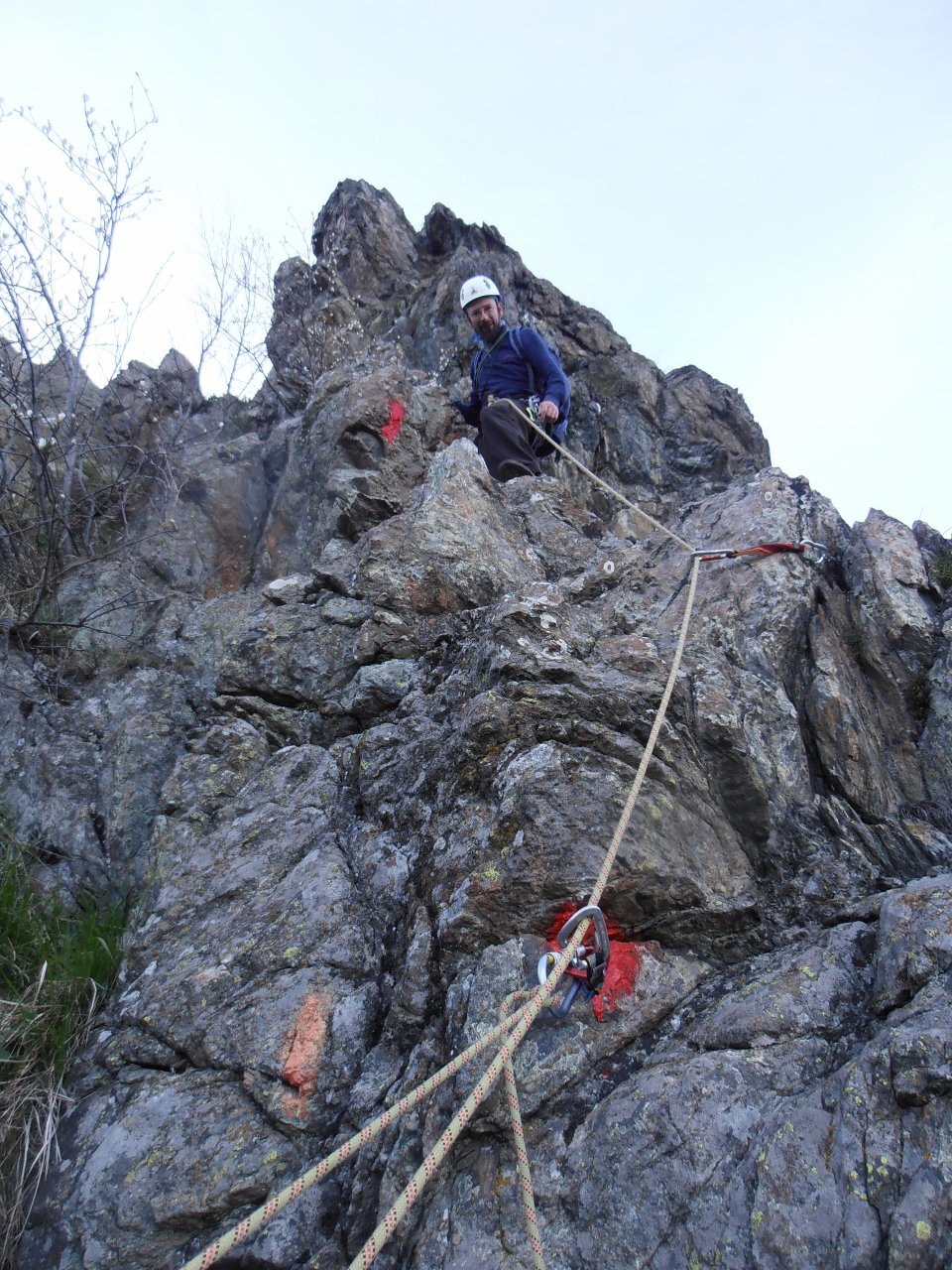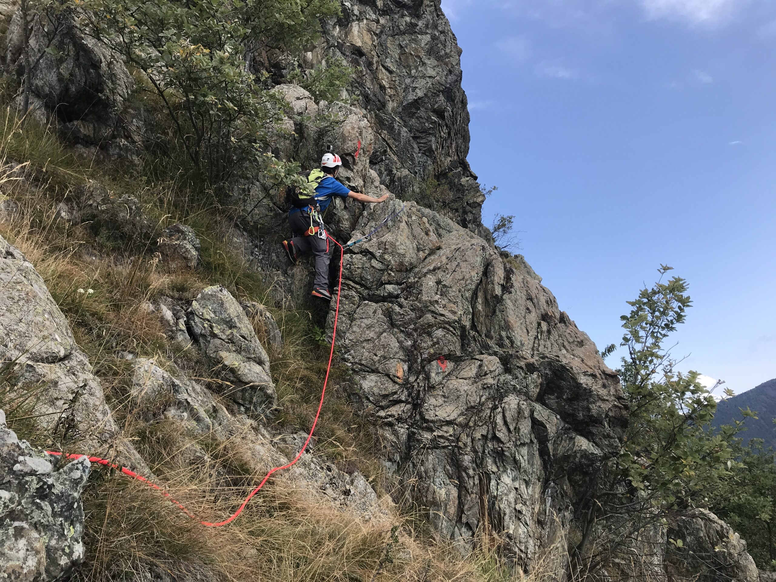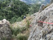 Si seguono le tacche rosse che indicano anche l’ubicazione di alcuni chiodi da usare in caso di cordata, specie nella parte bassa.