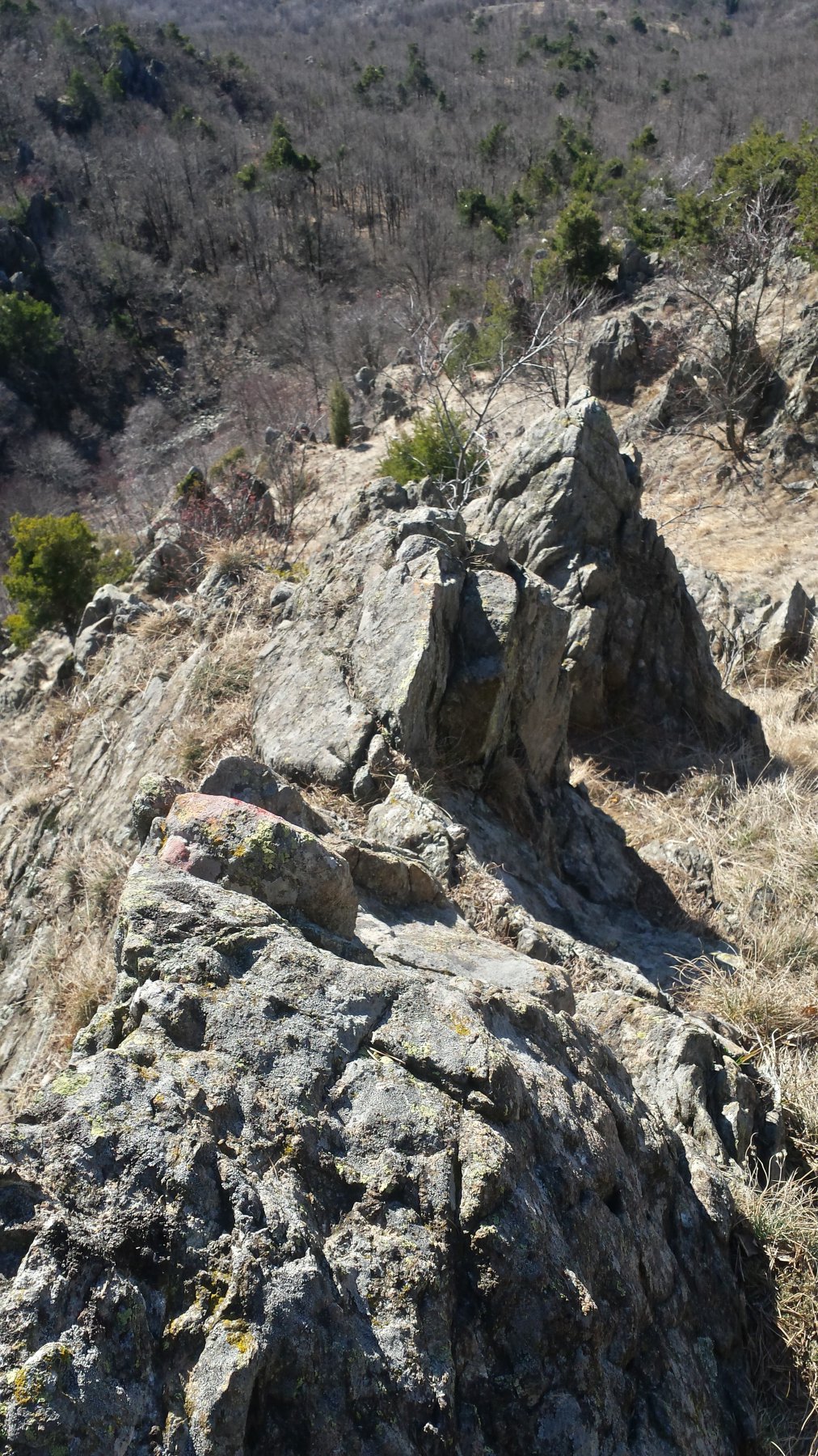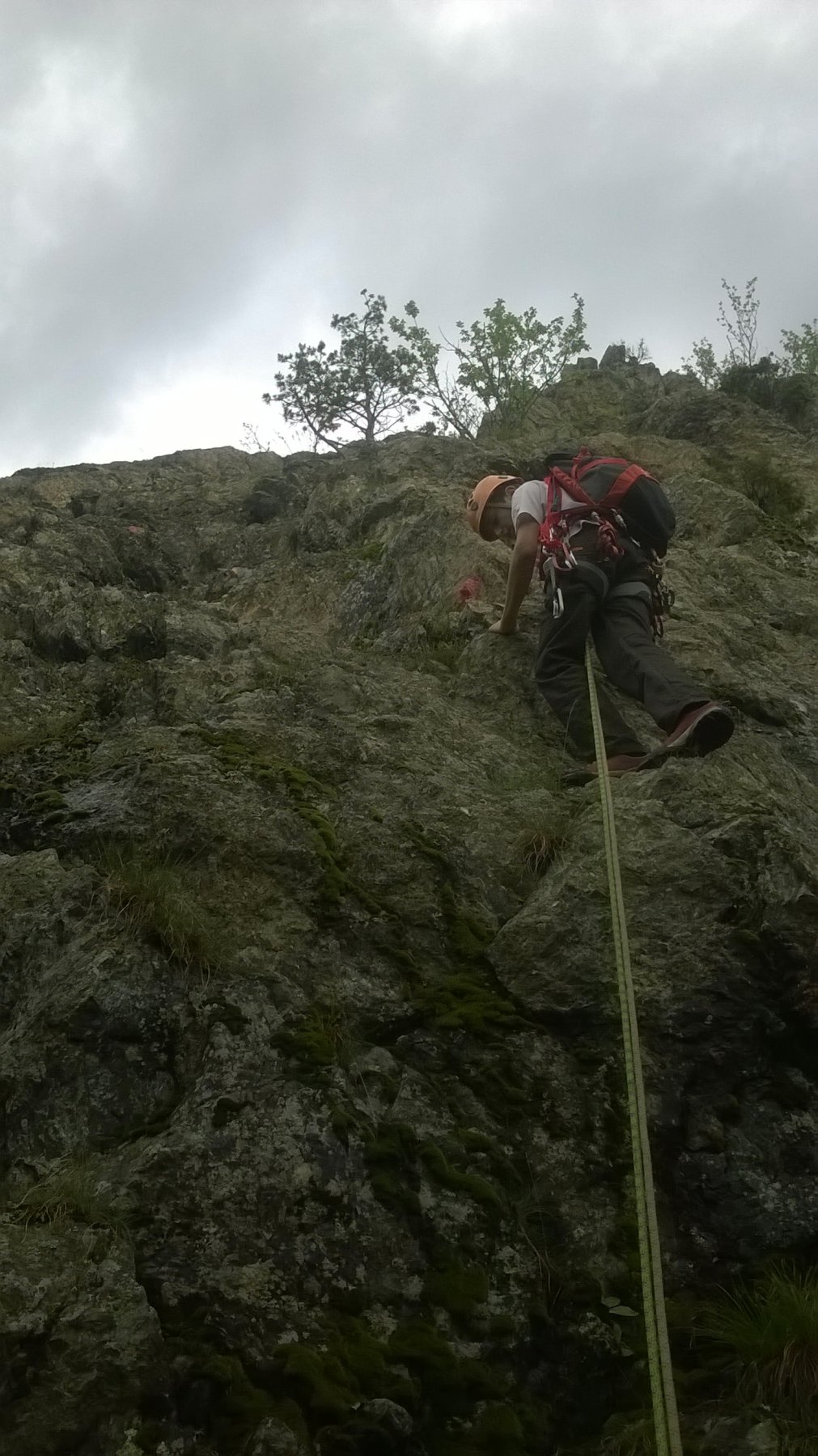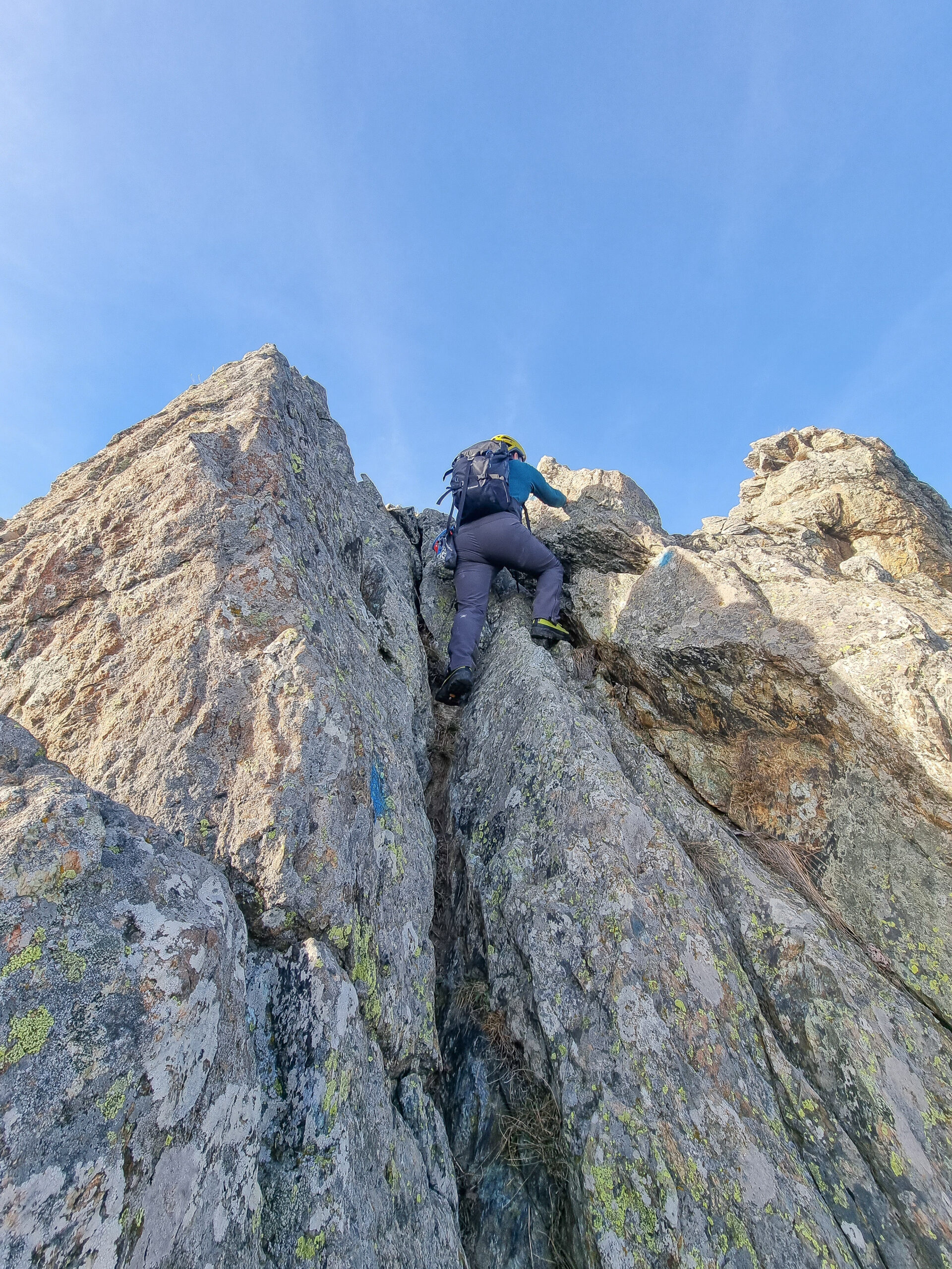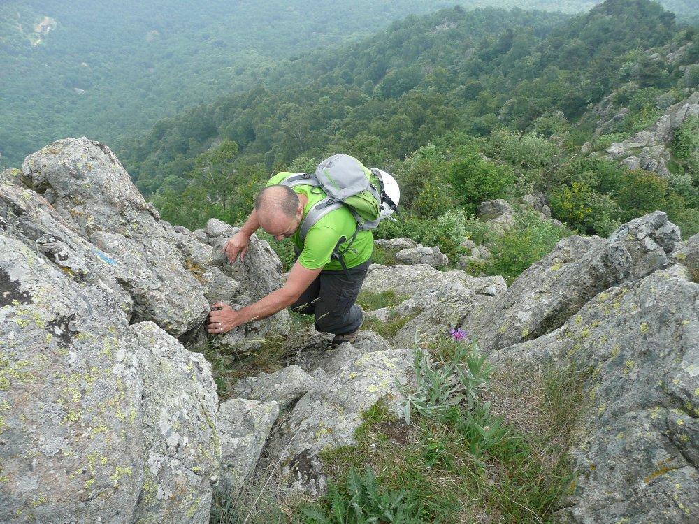 Si seguono le tacche rosse che indicano anche l’ubicazione di alcuni chiodi da usare in caso di cordata, specie nella parte bassa.