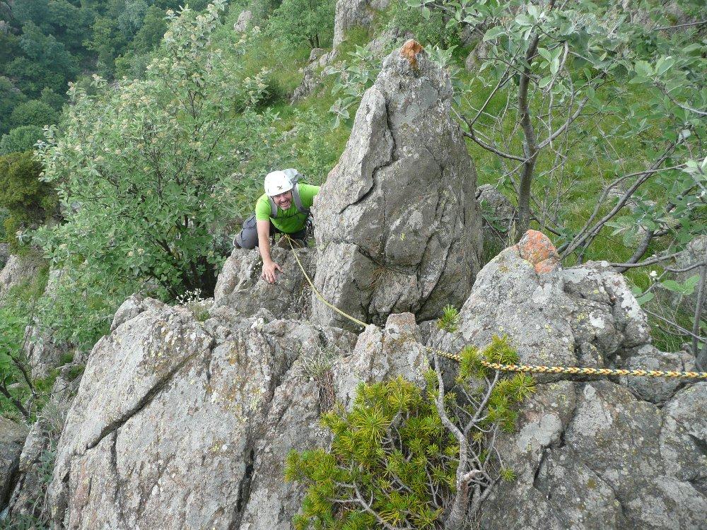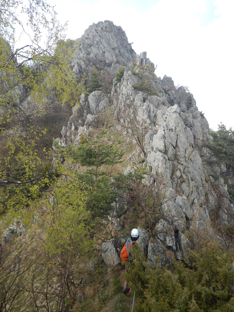 Nella parte alta si alternano cenge erbose e facili torrioni in parte aggirabili e si arriva sul sentiero Aurora da dove, per dare una continuità alla roccia, si consiglia di continuare su Amici 2, segnalata a tacche blu.