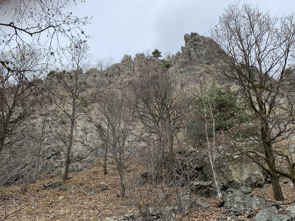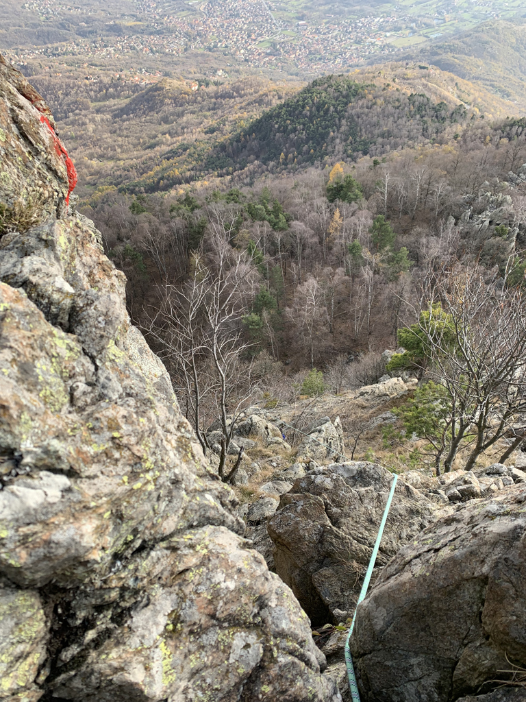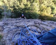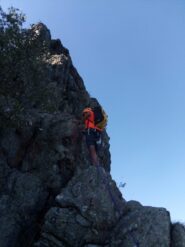 Da quì si segue indicazione per Amici/Aurora su bel sentiero semi pianeggiante verso est. Si oltrepassa l’attacco segnalato della Amici e poco oltre si arriva alla scritta arancione su di un masso che indica l’attacco del percorso Mike.