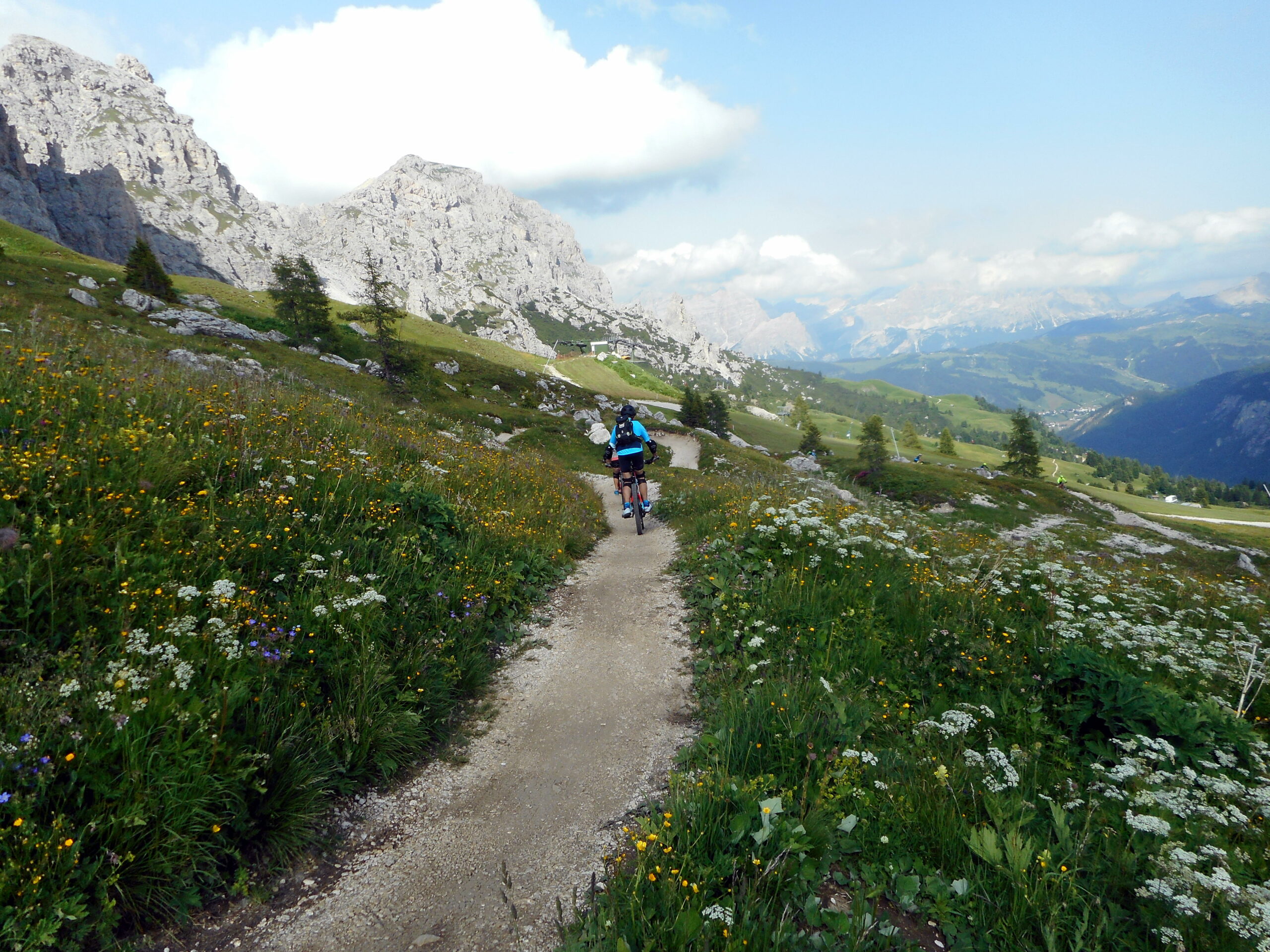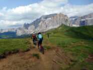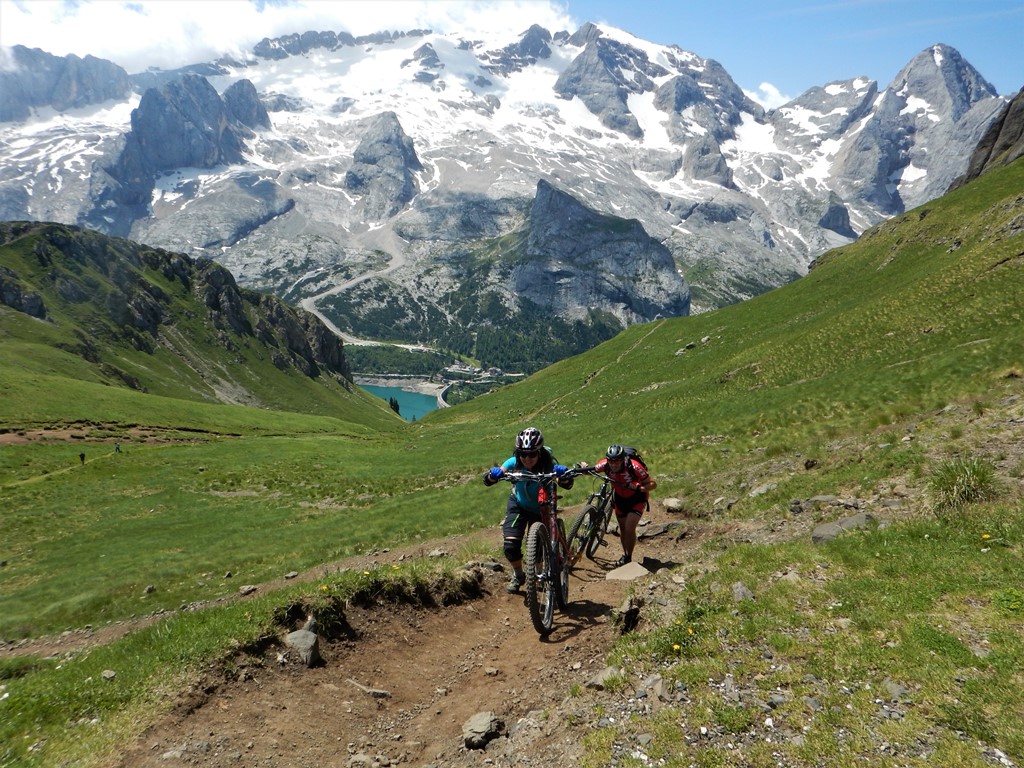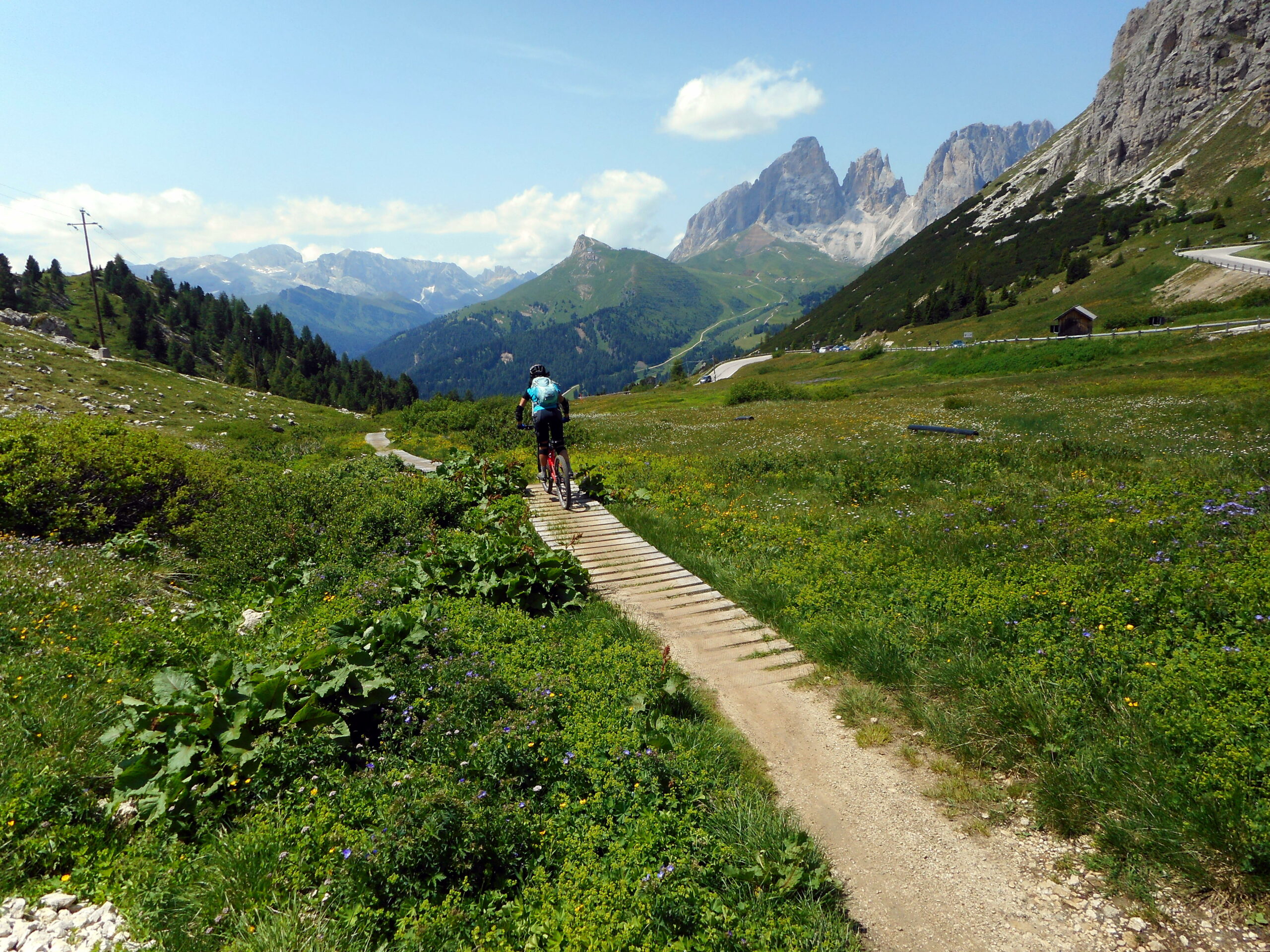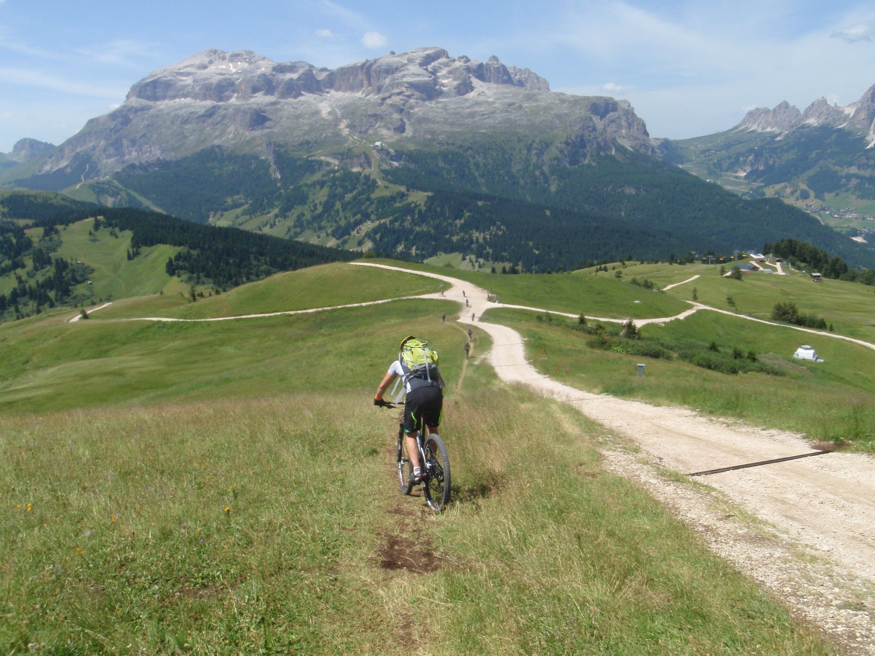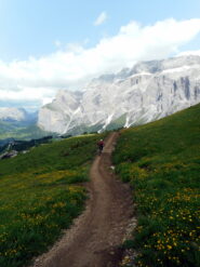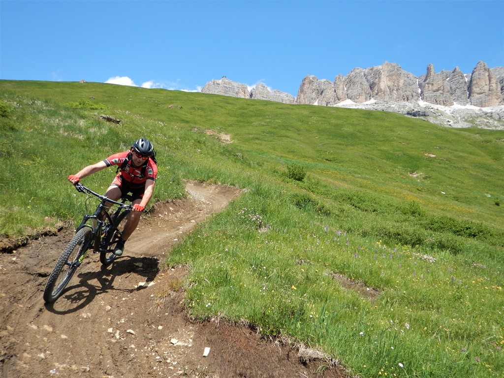 Scendere inizialmente sulle piste, a tratti ripide, in direzione Ovest, poi in prossimità di un curvone a destra che farebbe cambiare direzione al ns. procedere, reperire il sentiero 680 che in single track con saliscendi e qualche passaggio obbligato e tecnico, ma sempre ciclabile, porta nei pressi del Passo Pordoi; dietro un ristorante con un carretto fiorito all’entrata, reperire una traccia sui prati che ci consente di evitare l’asfalto e di raggiungere il Passo con qualche tratto al limite della pedalabilità. Scendiamo sul versante di Canazei con il bellissimo sentiero 627, fino all’albergo Pordoi, poi ancora in discesa fino a Pecol.