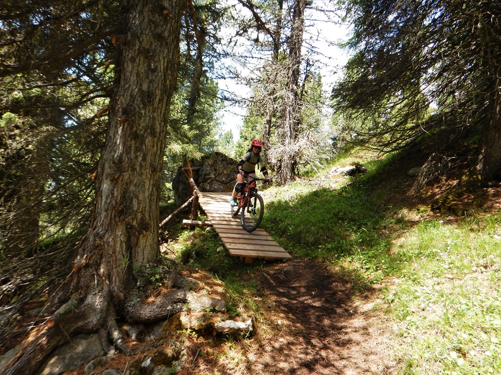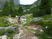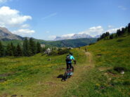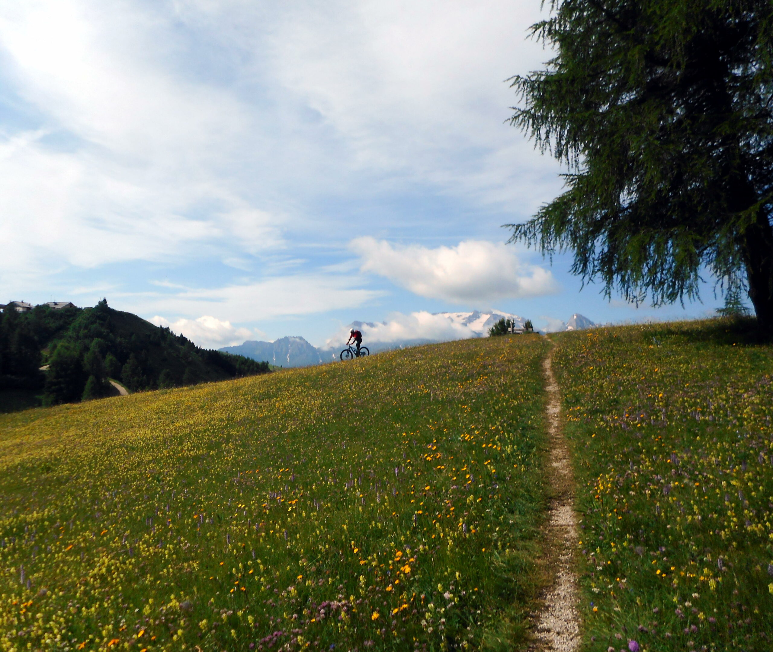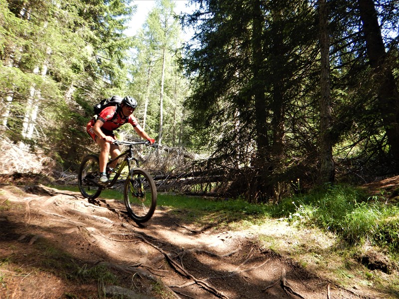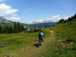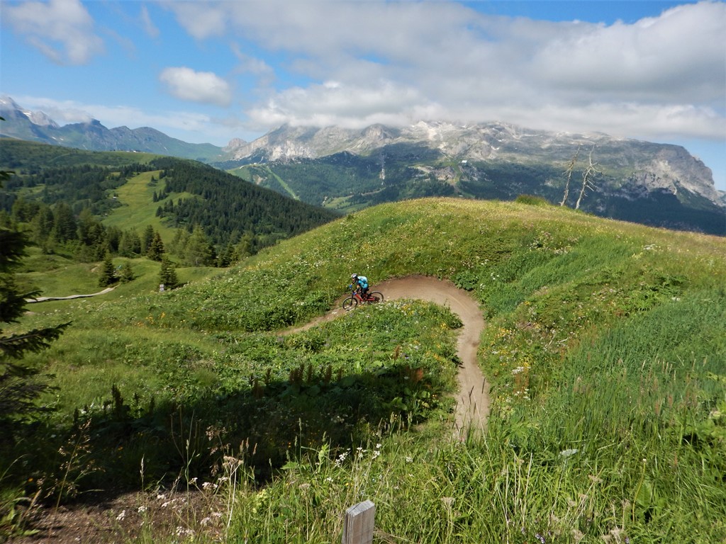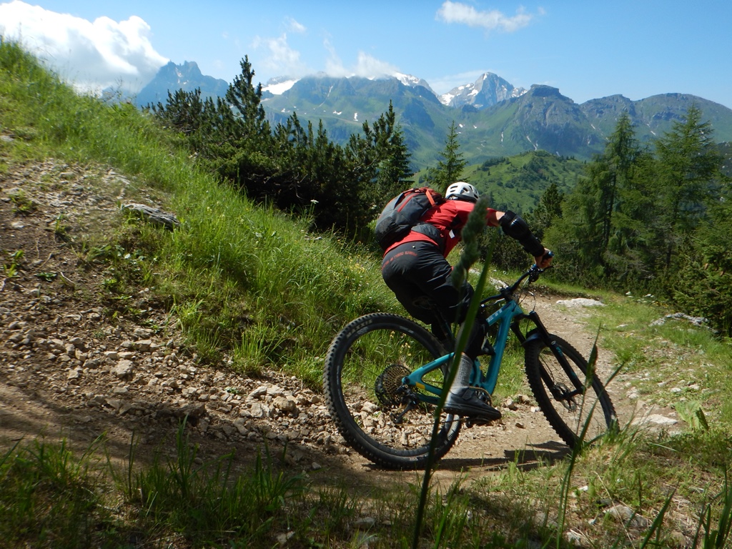 Scendere inizialmente sulle piste, a tratti ripide, in direzione Ovest, poi in prossimità di un curvone a destra che farebbe cambiare direzione al ns. procedere, reperire il sentiero 680 che in single track con saliscendi e qualche passaggio obbligato e tecnico, ma sempre ciclabile, porta nei pressi del Passo Pordoi; dietro un ristorante con un carretto fiorito all’entrata, reperire una traccia sui prati che ci consente di evitare l’asfalto e di raggiungere il Passo con qualche tratto al limite della pedalabilità. Scendiamo sul versante di Canazei con il bellissimo sentiero 627, fino all’albergo Pordoi, poi ancora in discesa fino a Pecol.