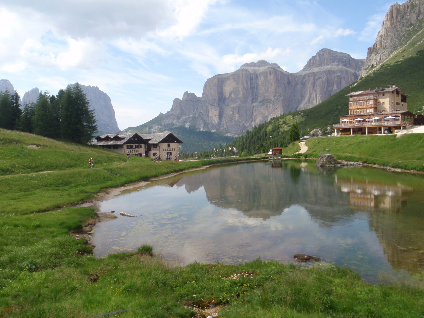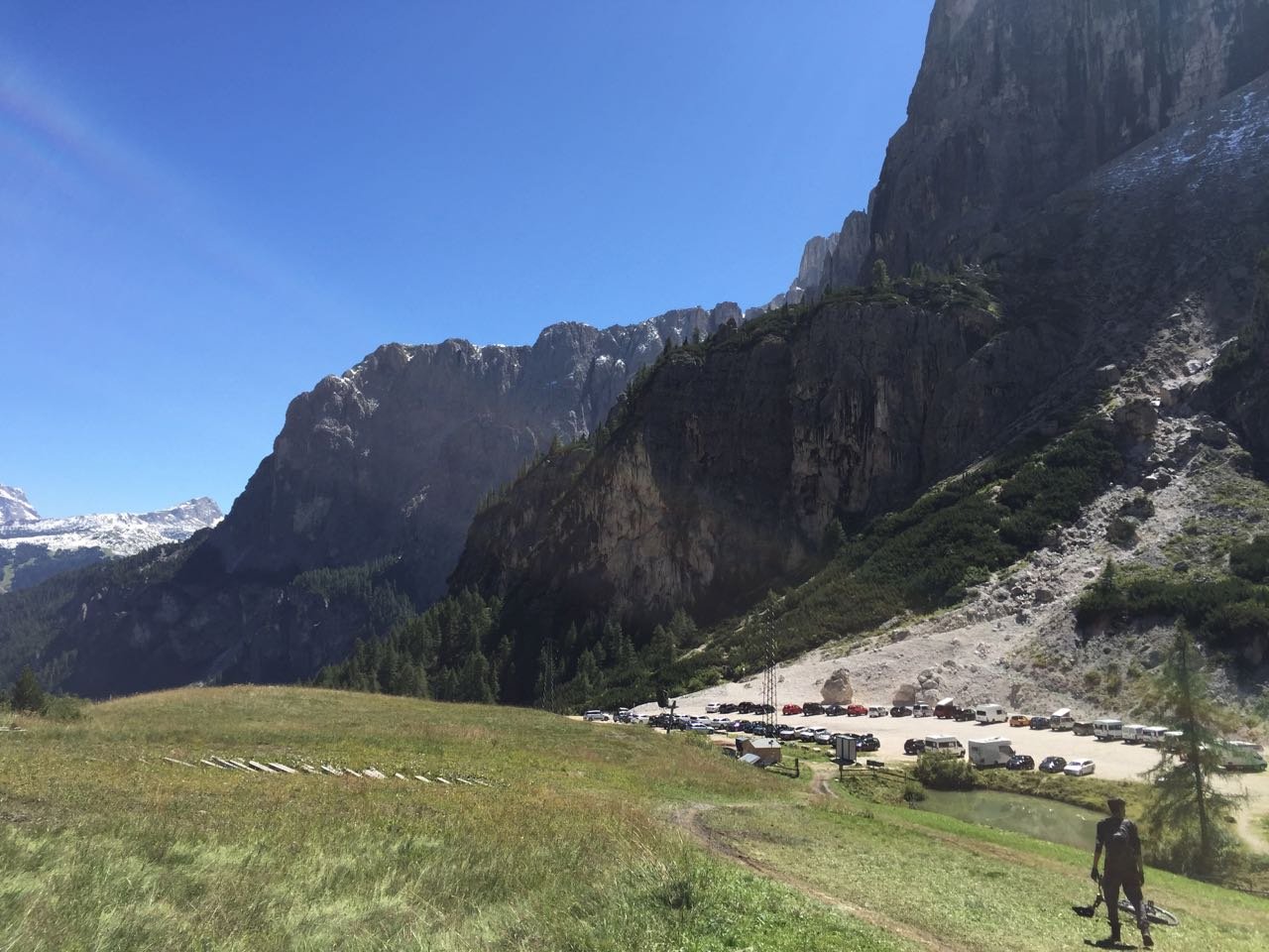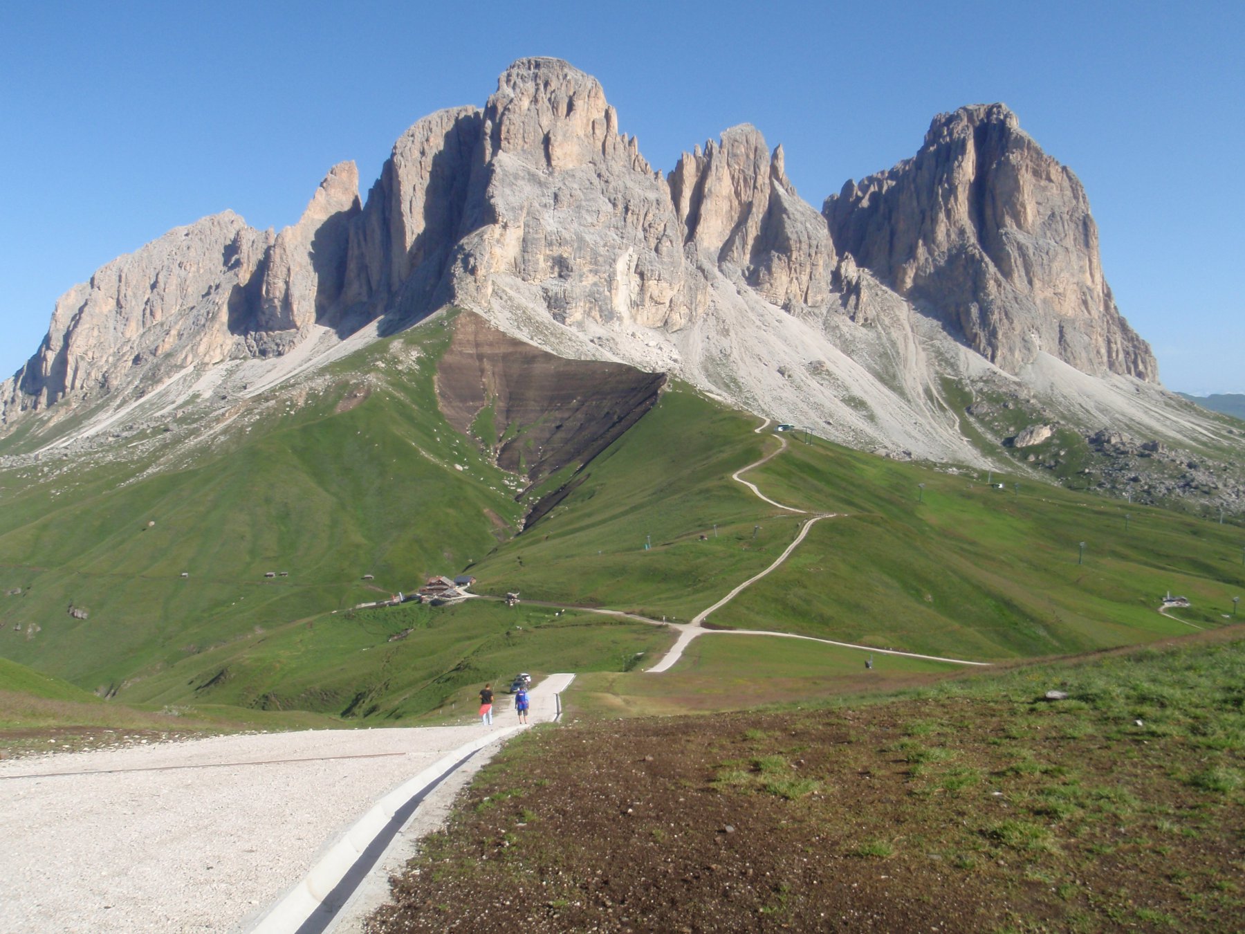 Di nuovo il panorama è eccezionale. Scendere al Passo Sella con una delle varie stradine e sentieri alternativi.