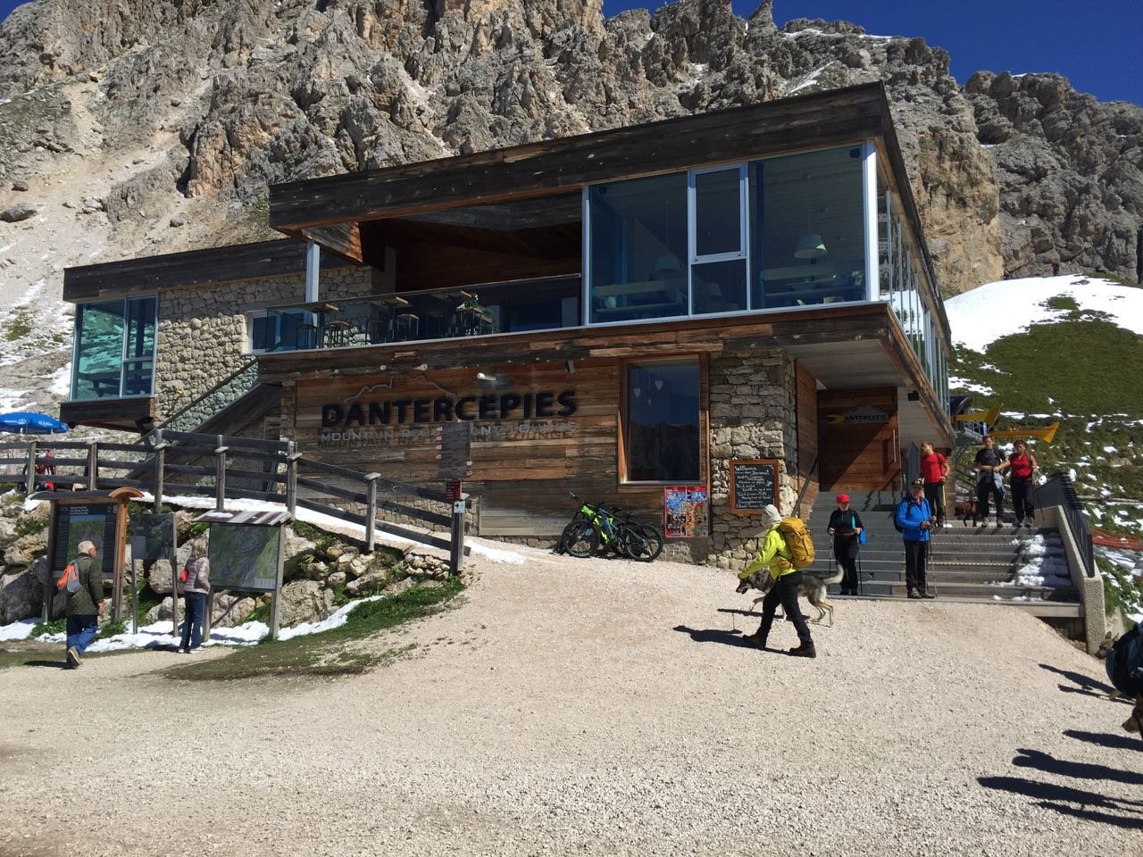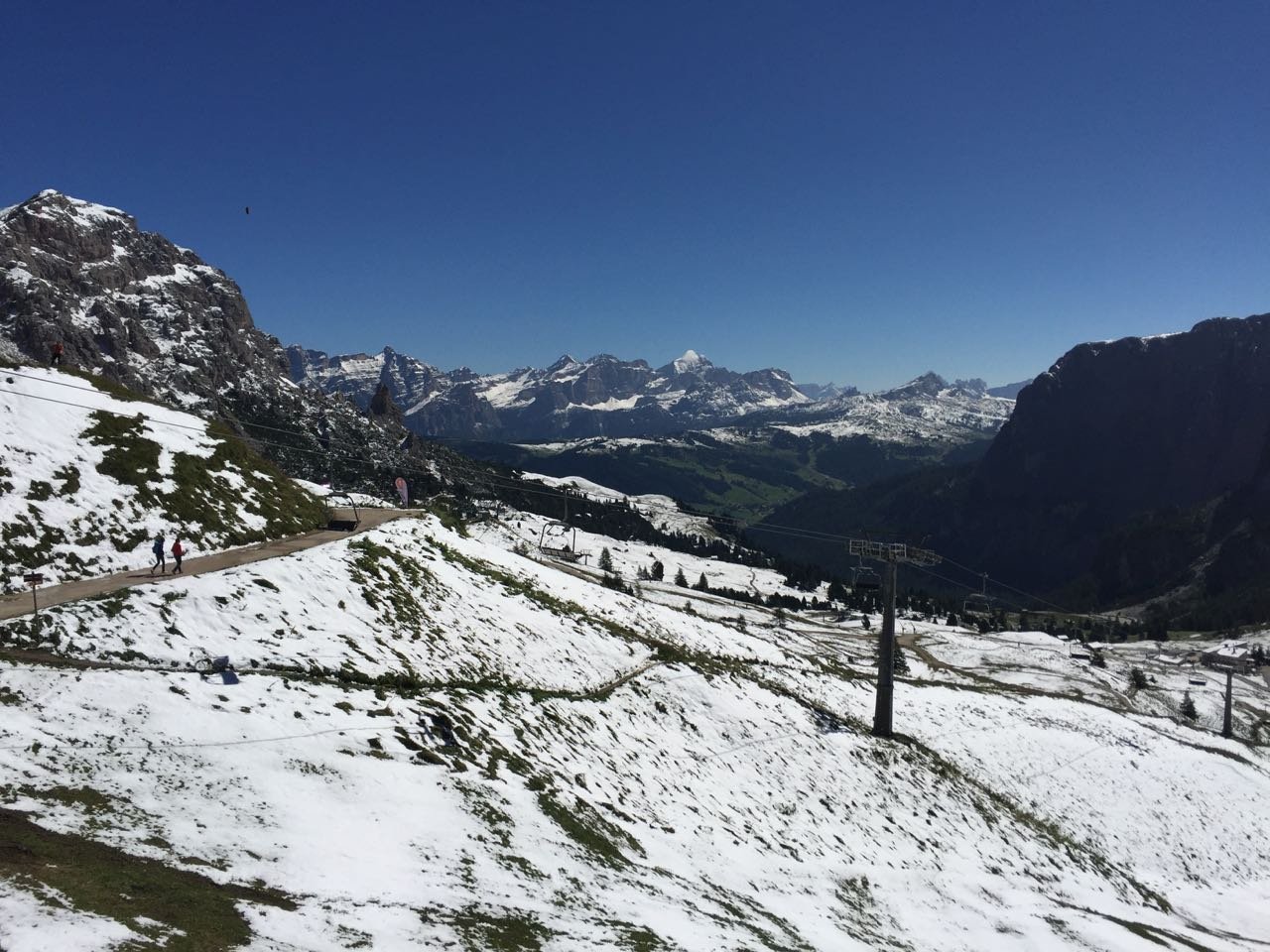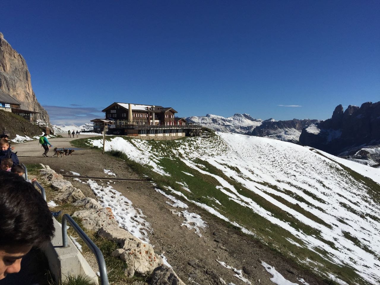 Da qui saliamo a Porta Vescovo (punto più alto del giro) con la Funivia. All’arrivo merita fermarsi qualche minuto a gustarsi il panorama delle Dolomiti: da un lato la Marmolada con il ghiacciaio, dalla parte opposta il Sella col Sass Pordoi e il Piz Boè. Spettacolare!