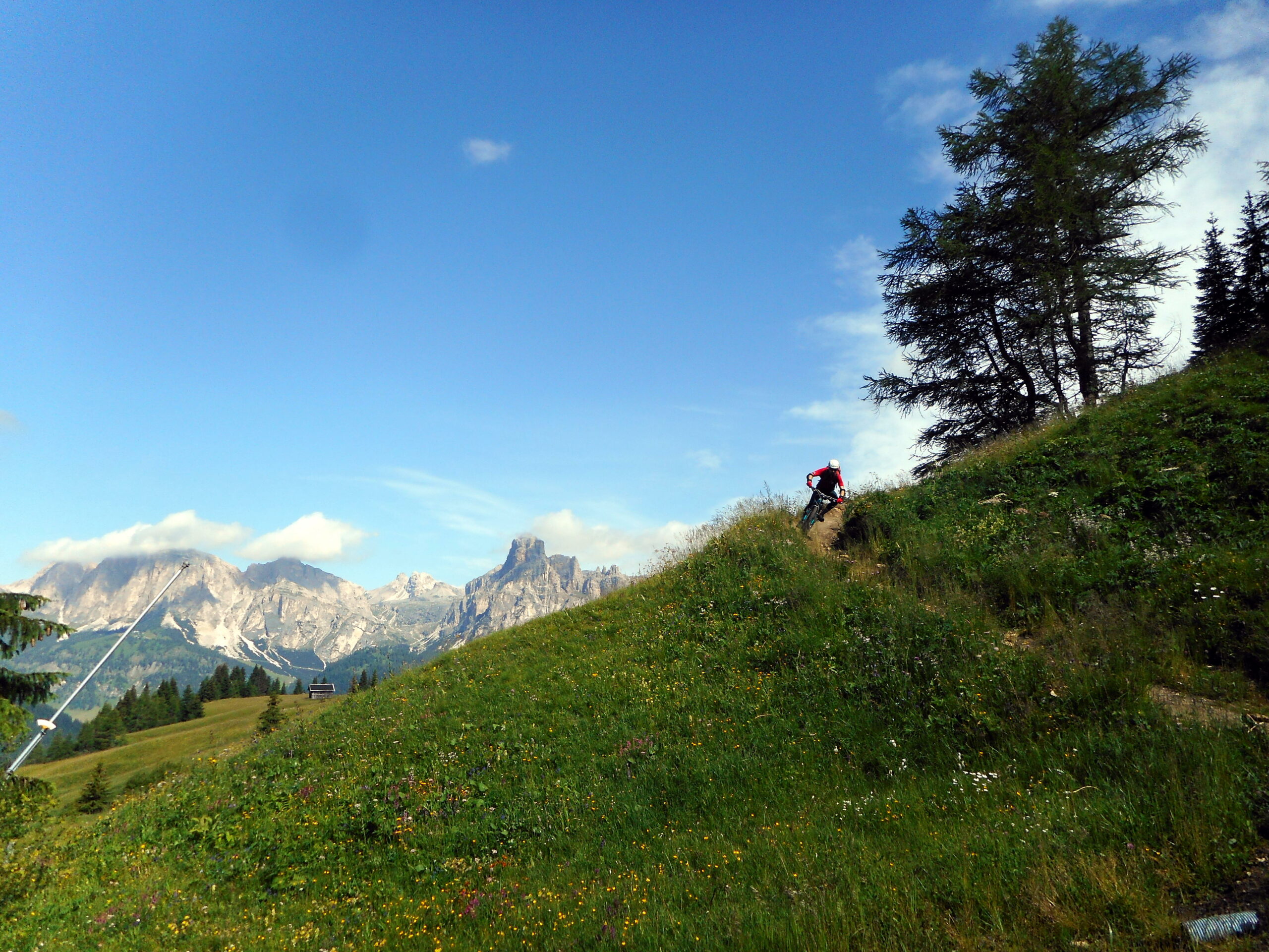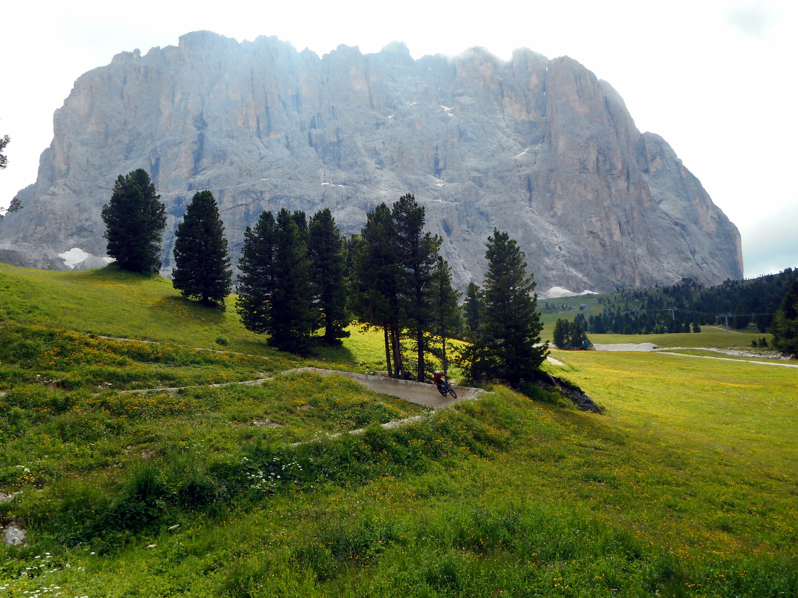 2) prendere il sentiero 528 che in leggera salita attraversa la città dei sassi e pedalando con panorami mozzafiato sulla ns destra, porta al Rif. Comici. Da qui sempre con il sentiero 528 che poi diventa sterrata o con altre piacevoli varianti si giunge agli impianti di Monte Pana. Si percorre un tratto di asfalto in discesa poi in prossimità di un tornante a sin andiamo dritto dentro un gruppo di baite da cui parte un single track che in breve porta ad attraversare la pista Sasslonch di Coppa del Mondo, in prossimità delle famose curve dei Ciaslat; in breve scendiamo a Selva e terminiamo il fantastico giro.