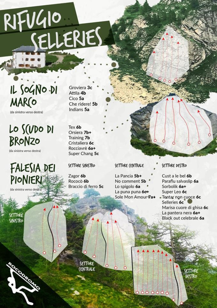 Si tratta di una Falesia estiva facilmente accessibile nel periodo di apertura della strada che porta al rifugio Selleries.