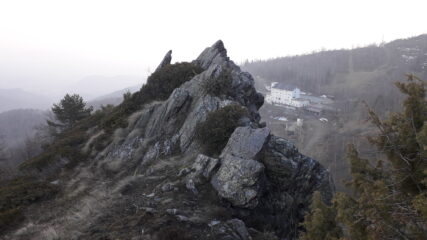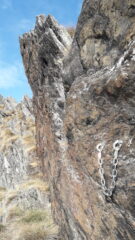 Non mi sono trovato relazione sottomano con quanto constatato sul posto. Una crestina breve estremamente facile con un sola placchetta spittata interessante, con sosta a catena in uscita. Si cammina tanto ma di arrampicata c’e’ ne ben poca. Sta di fatto che.. comunque.. sempre meglio che stare a casa.