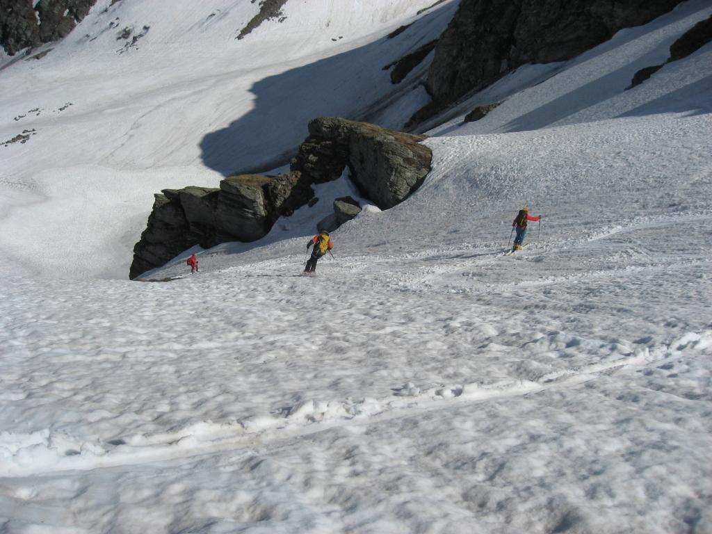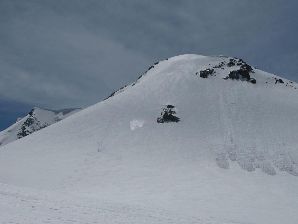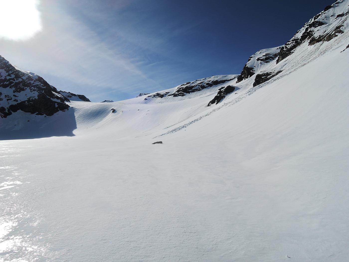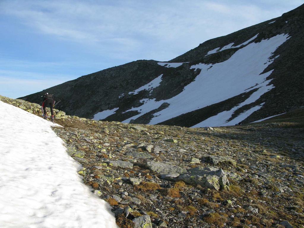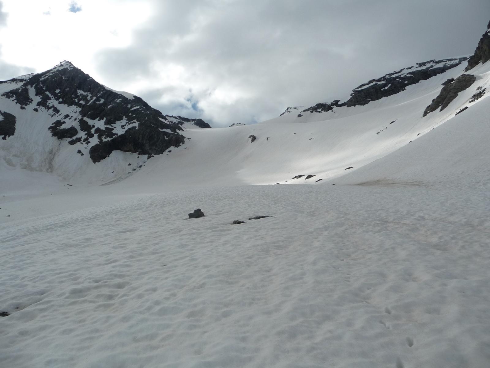 Aggirare la vetta verso est e risalire il pendio fin dove si può, occhio al ghiaccio!