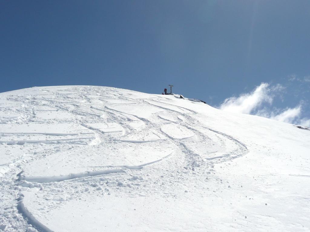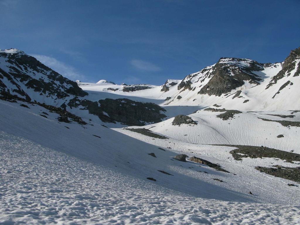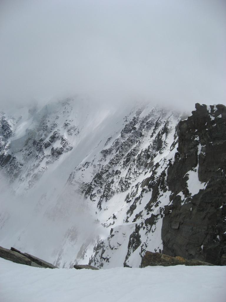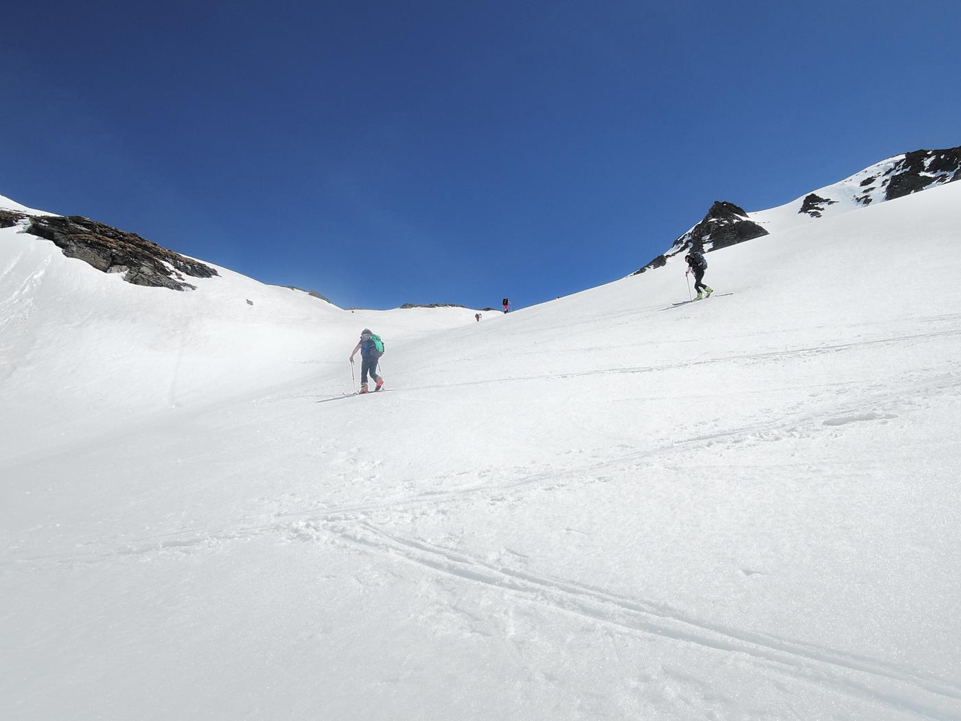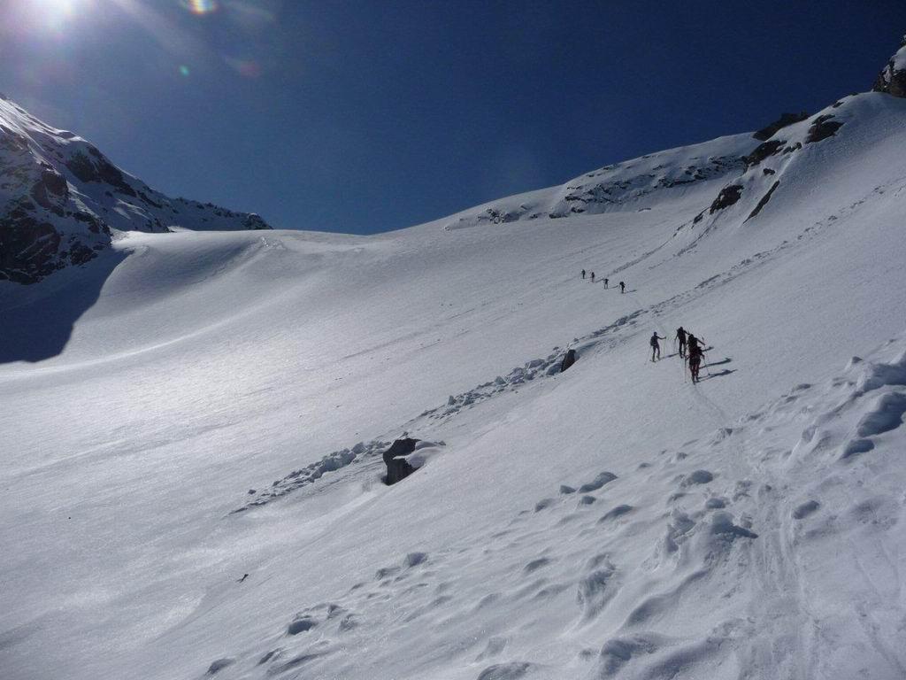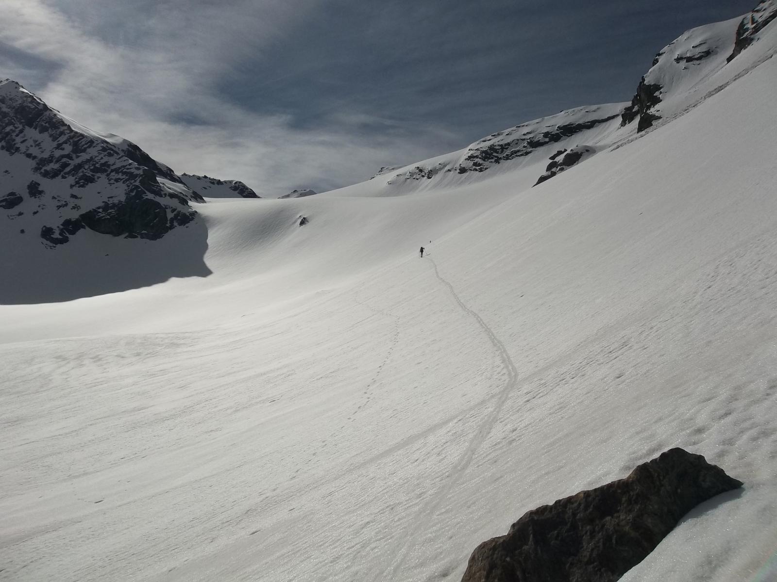 Aggirare la vetta verso est e risalire il pendio fin dove si può, occhio al ghiaccio!