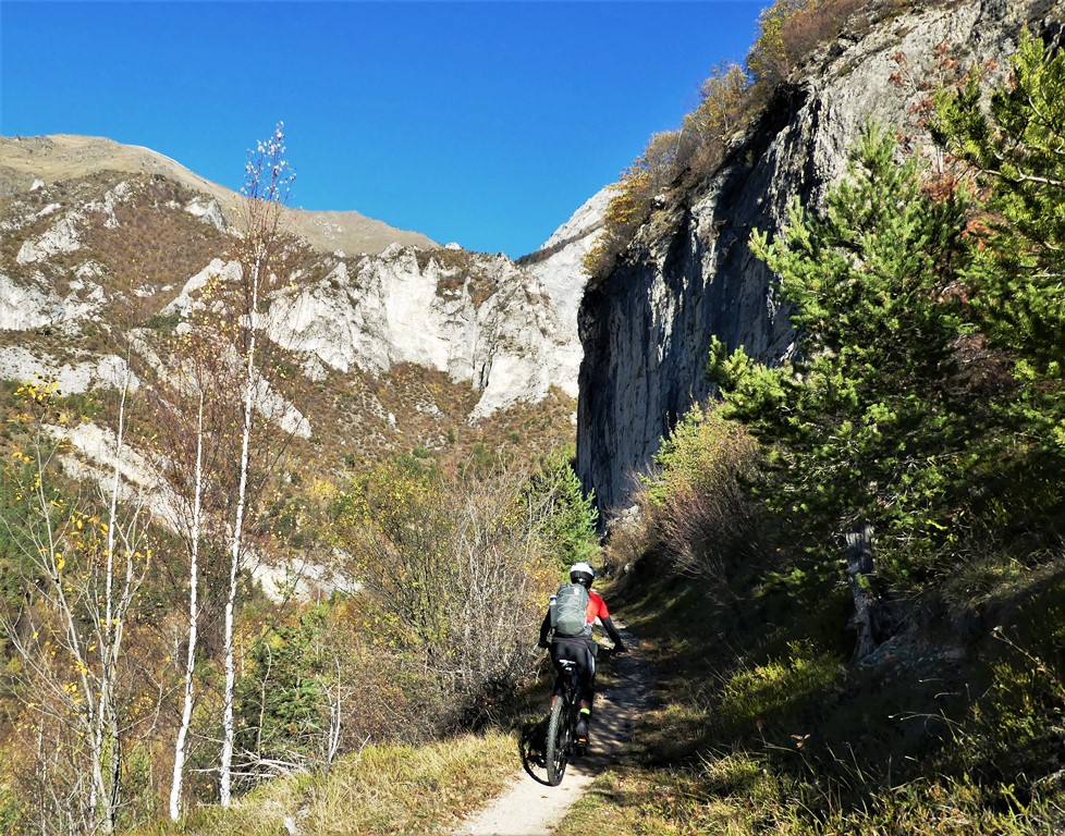 Seguendo le indicazioni per Macra, in breve giungiamo verso il fondo del paese, sull’ asfalto della statale; svoltiamo a destra fino al ponte con indicazione per Celle Macra: si cambia versante! Attraversato il ponte, ci aspettano 5 km di salita con pendenza regolare. Attraversiamo le borgate Matalia e Bassura fino a giungere a Celle Macra, che lasciamo alla nostra destra, proseguendo fino alla borgata Ansoleglio, che attraversiamo fino a fine asfalto. Si scende! Inizialmente lo sterrato è largo, poi si stringe in un single-track liscio e veloce, costellato di piloni votivi. Ai bivi (il primo con pilone a sinistra poco sotto) teniamo la destra, poi proseguiamo a sinistra (palina MTB) che invece ignoriamo successivamente, tenendoci in quota a destra.