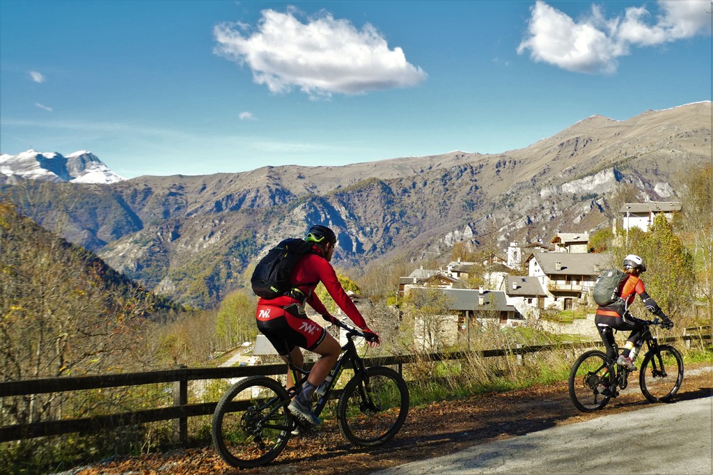 Pedaliamo in direzione Acceglio per scaldarci le gambe in vista della salita per arrivare a Camoglieres, cui arriviamo dopo 1,7 km circa: svoltiamo a destra e attacchiamo le dure rampette che in 1,5 km ci portano all’ omonima e bellissima borgata, che attraversiamo in salita fino a giungere al bivio palinato “via ferrata” e sentiero dei ciclamini, il nostro obbiettivo da seguire a sinistra… comincia lo sterrato!