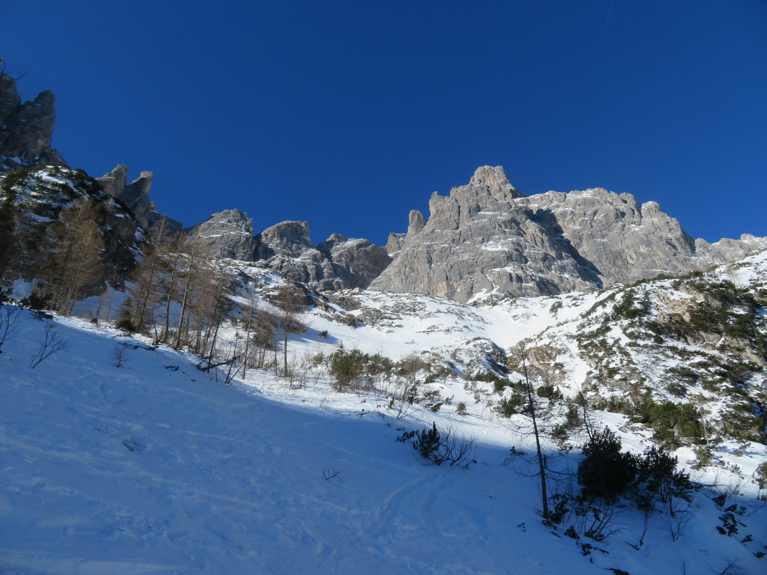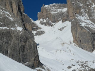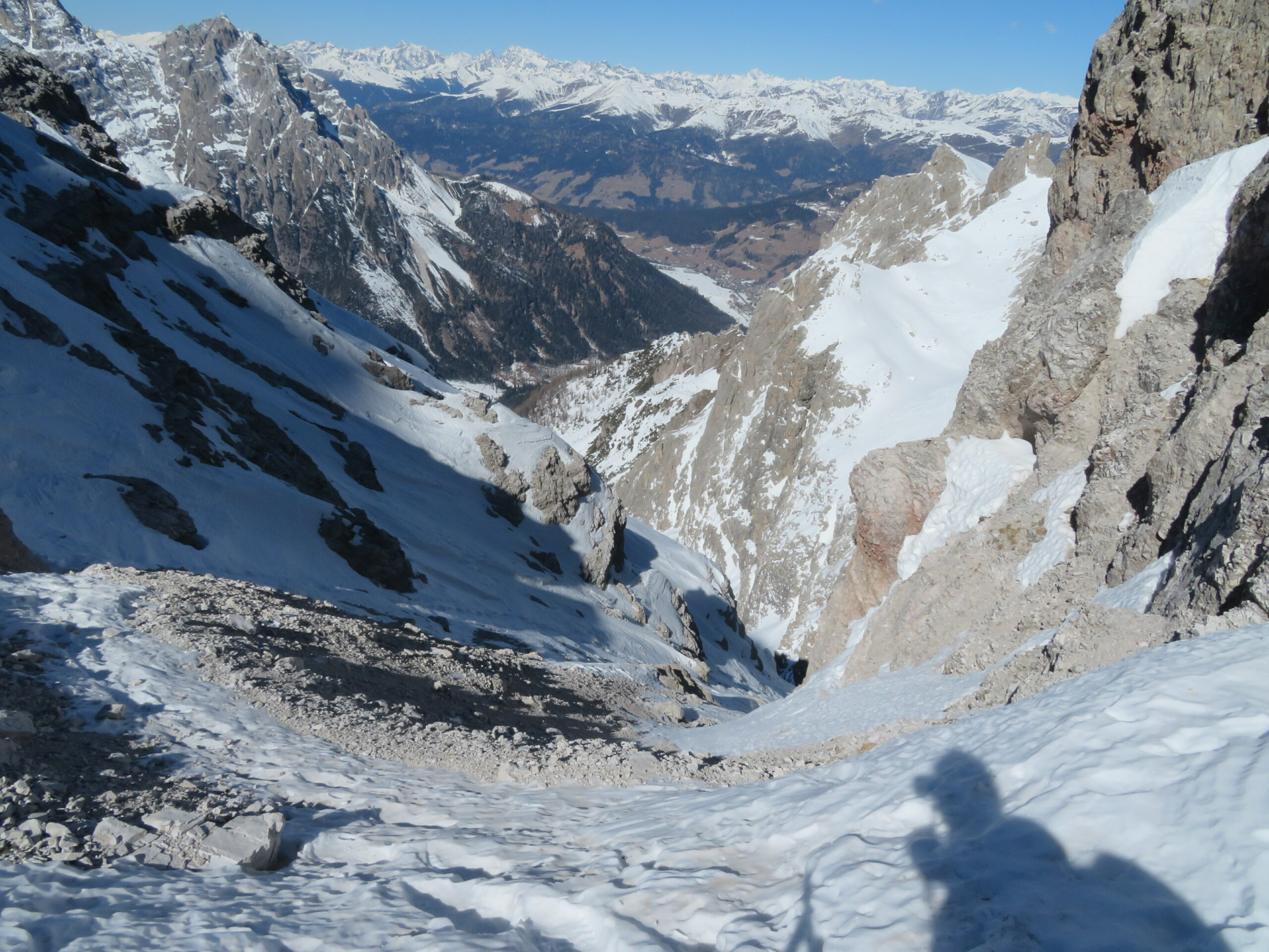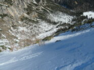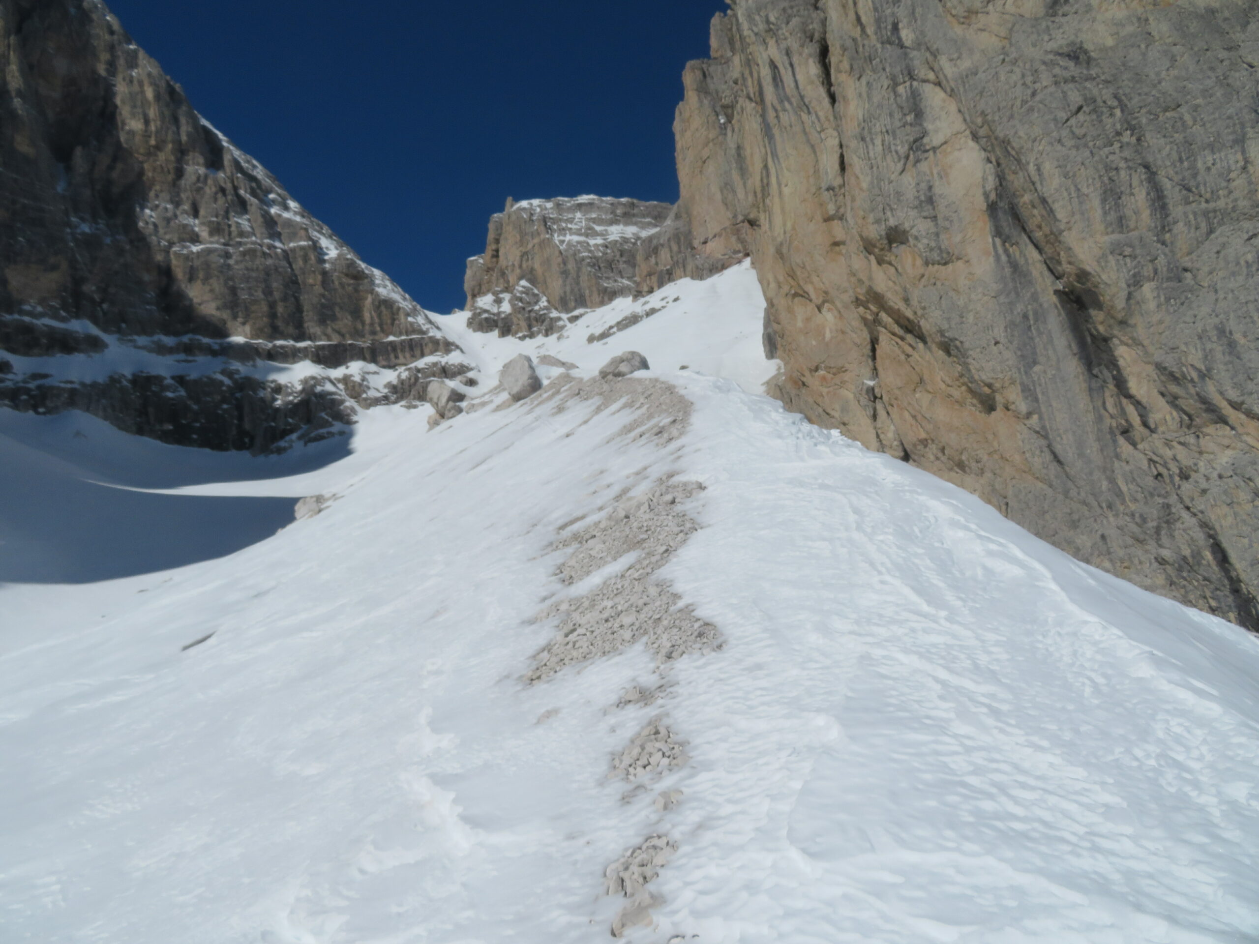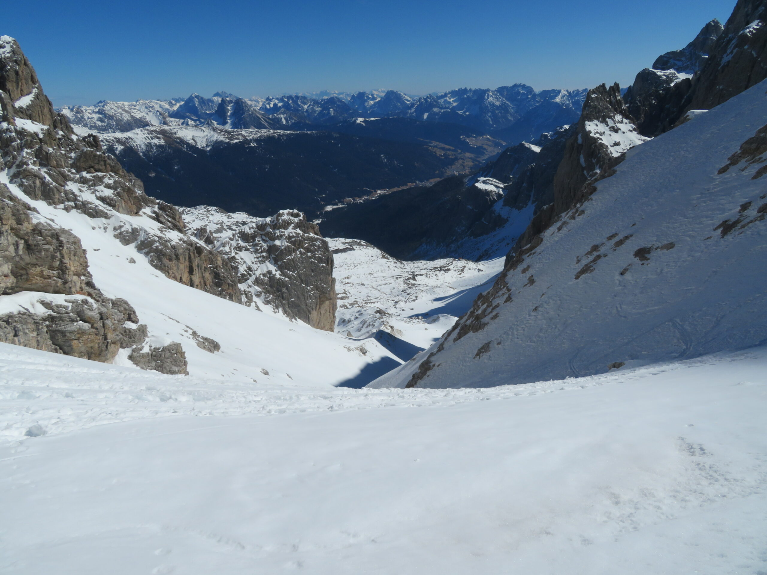 Una volta entrati nel vallone tagliando alti i pendii si può evitare di scendere nel fondo valle e si prosegue con direzione evidente verso il passo. Gli ultimi 10om più ripidi eventualmente a piedi. Discesa per le tracce di salita o in traversata verso Sesto (pendii OSA).
