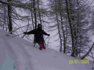 Nevicata fitta con – 7° e mezzo metro alla partenza e un metro e più sul colle. Farina fantastica per tutto il percorso, Fuori dal bosco visibilità scarsa. e raffiche di vento in prossimità del colle.Ho contato circa 60 compagni di gita ,ma con questa neve c’è posto per tutti. Un saluto a Massimo addetto al recupero zaini…