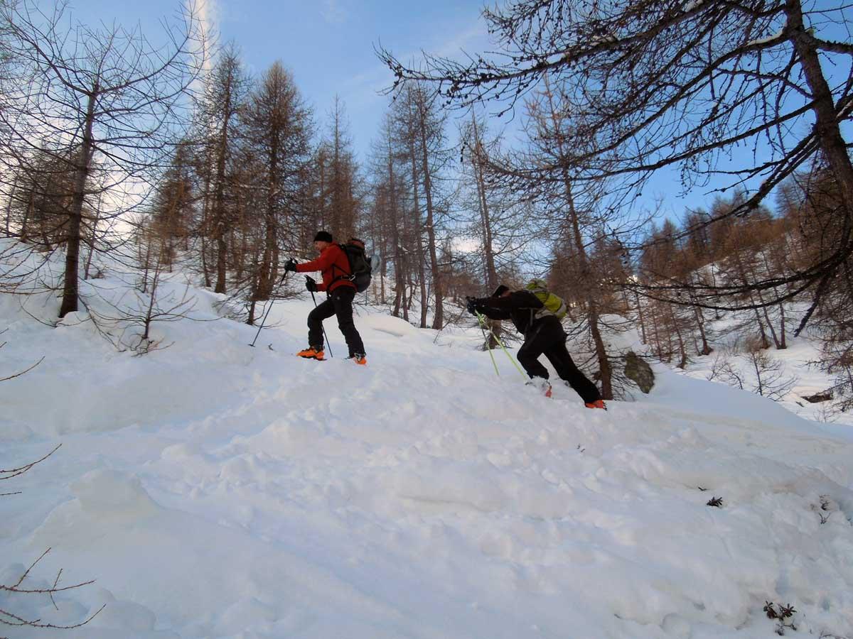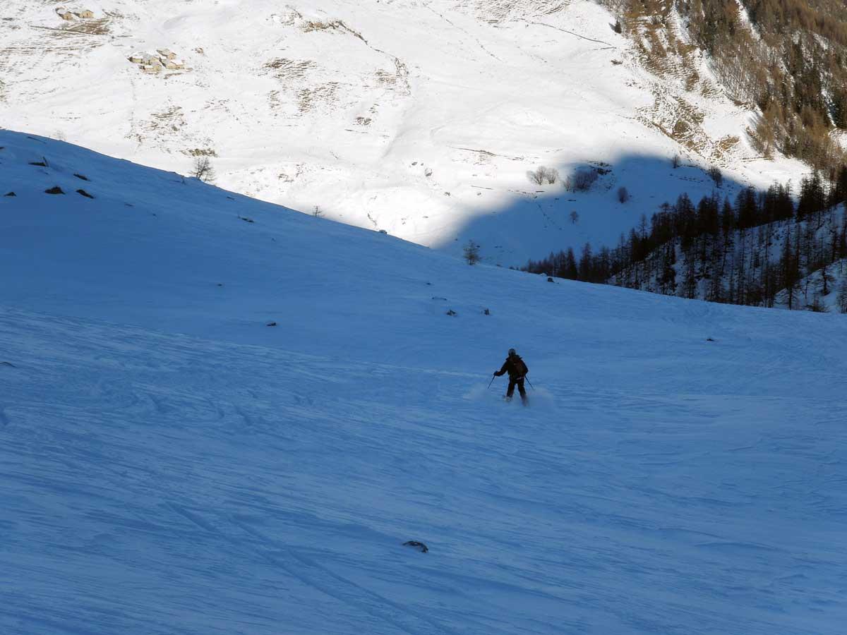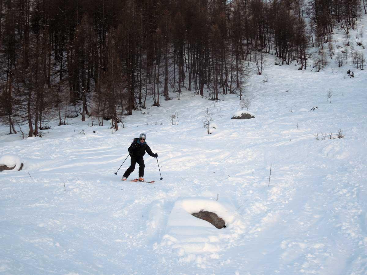 Sci dal parcheggio su traccia ben battuta, come sempre, che taglia i vari tornanti della strada. Neve già un po’ umida da Arp du Bois per le temperature non proprio fredde, con una leggera ed innocua crosticina nella parte superiore che non ha creato difficoltà in discesa. Tutto sommato, pur trovando sempre neve morbida, non ci siamo divertiti gran che ad effettuare curve; pietre nascoste sotto il leggero strato di neve caduta un paio di giorni addietro e qualche piccola gonfia di neve polverosa che rallenta la discesa. Nell’ultima parte abbiamo sfruttato la stradina per evitare arbusti e pietre nel bosco.