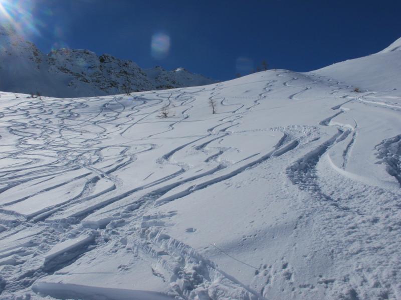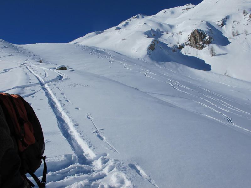 meteo perfetto: cielo sereno,sole e una arietta fresca su tutto il tracciato che ha mantenuto la neve perfetta. ottima traccia di salita. discesa alle 11.30 su farina leggera e soffice dal colle fino in fondo in ampi spazi vergini. se rimangono queste condizioni, consigliata.