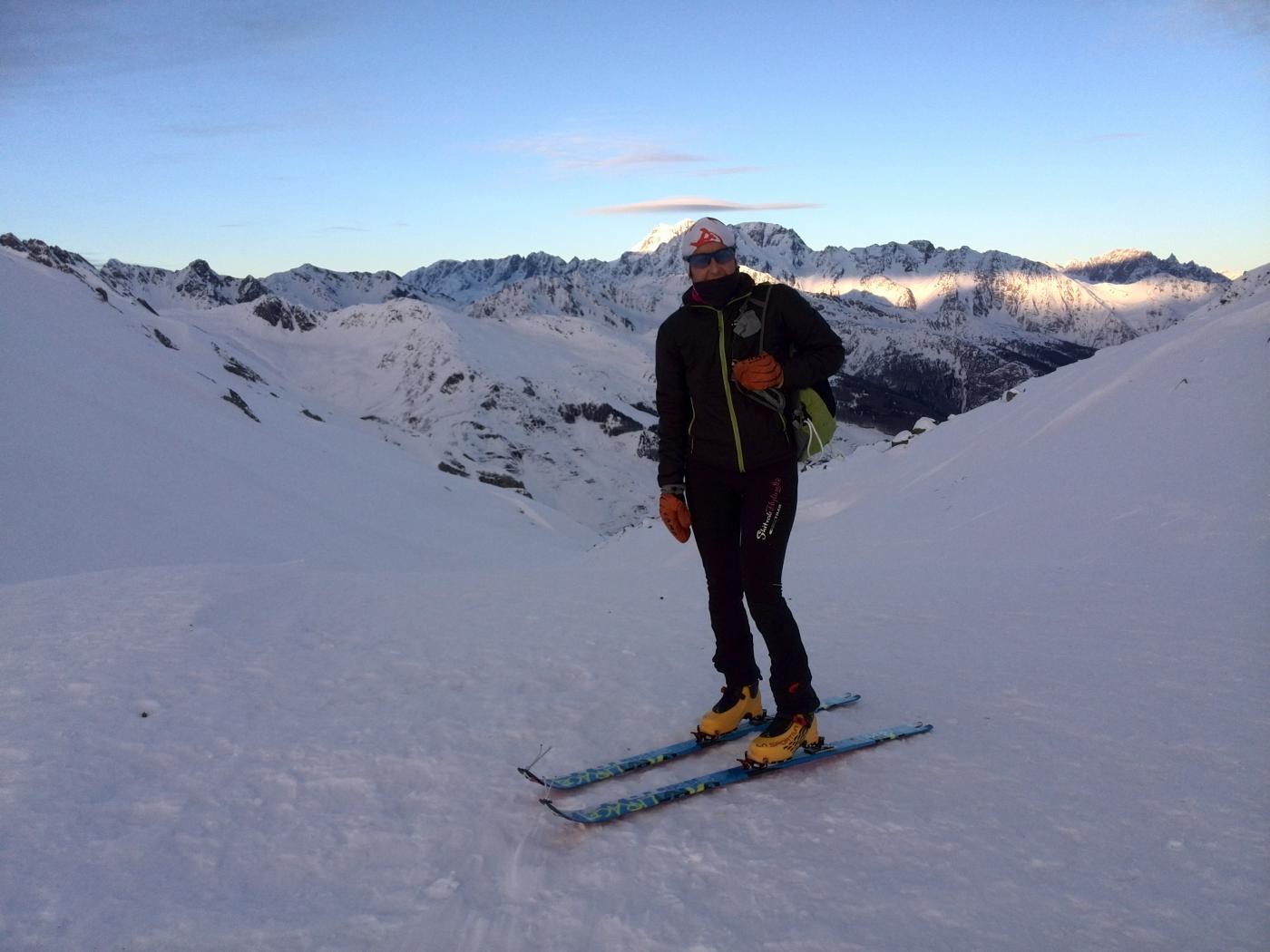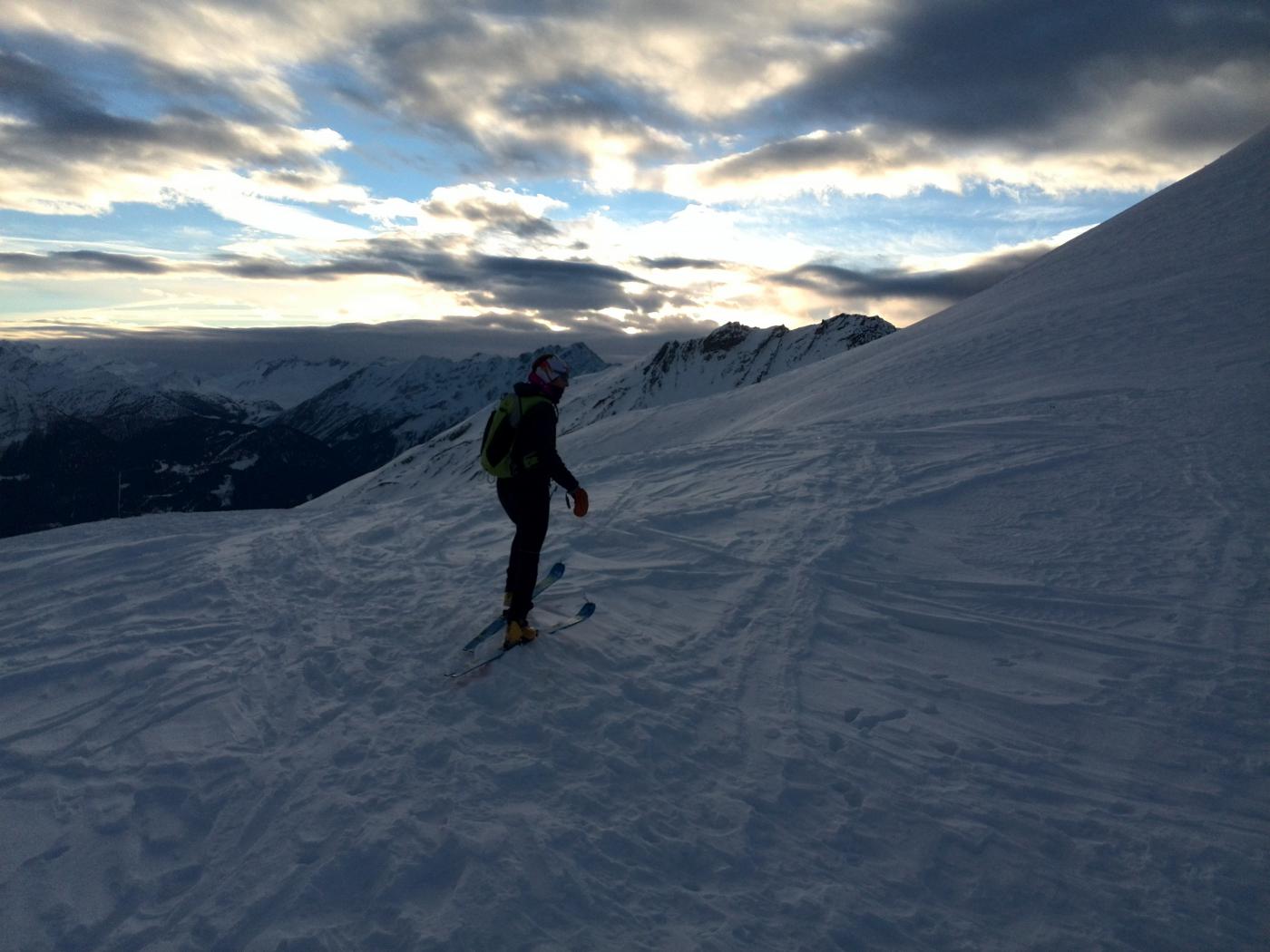 Gitarella post lavoro, partenza h 1630 circa 0 gradi al parcheggio -6 al colle con leggera brezza. Il vento dei giorni scorsi ha modificato notevolmente il manto nevoso, iniziato la discesa su tratti di crosta non portante alternati a tratti ben più sciabili. Dal bosco in giù ancora divertente nonostante i numerosi passaggi.