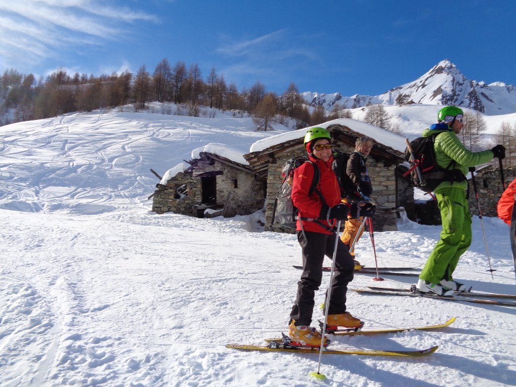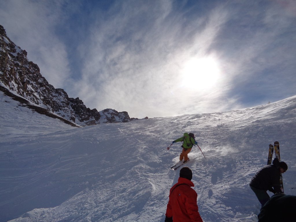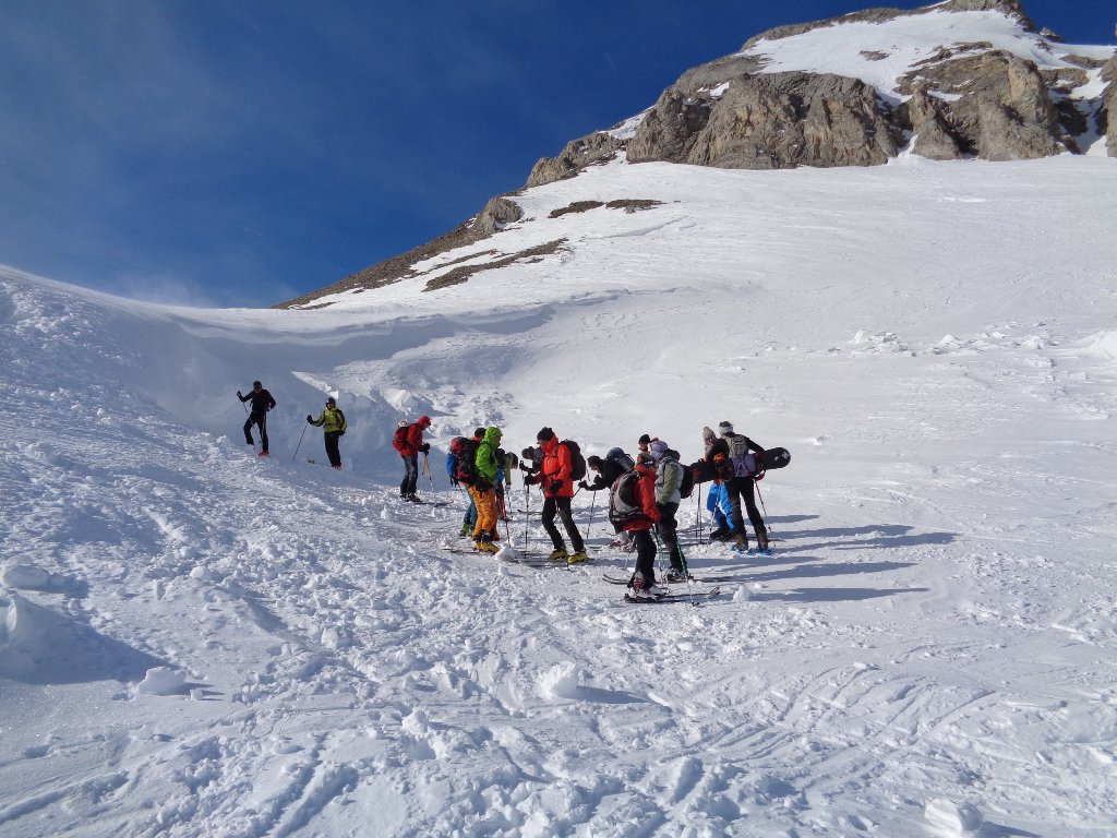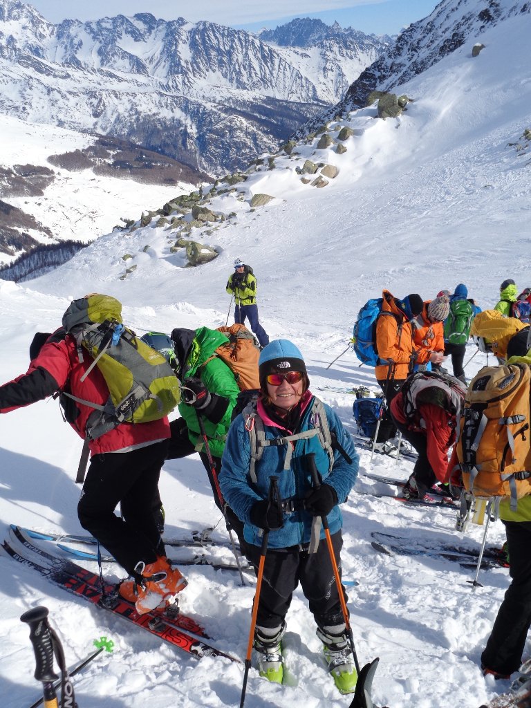 Aria frizzante, raffiche di vento al colle, mi sono tolta le pelli 50m sotto dove ci siamo ricompattati.
