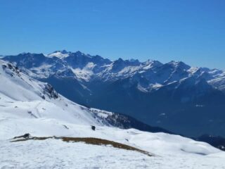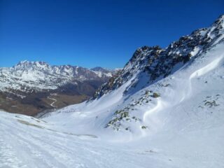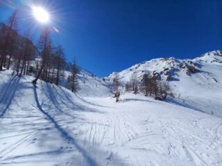 Partito alle 12, parte inferiore “no comment” si mettono gli sci dopo la pista di ghiaccio. Praticamente un pista da sci fino al colle. Discesa gradevole sopratutto nella parte superiore, dove cercando qualcosina di simpatico due S si riescono a fare. Scendendo bisogna fare attenzione a qualche sasso che affiora ma il tracciato è molto “piatto” oramai. Ottime condizioni per i vari canalini nei due versanti.