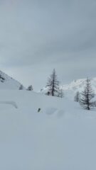 Nella “coumba freida” la neve non manca, purtroppo il vento dei giorni scorsi ha creato croste morbide generalmente non portanti oltre il limite del bosco. Nella parte bassa il carton lascia il posto a neve pesante e comunque faticosa.