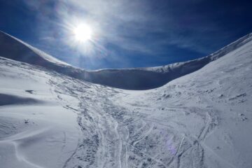 Neve polverosa in alto e farinosa compatta in basso. Zona molto trafficata ma abbiamo trovato ancora zone intonse.