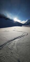 Discesa: sono stato a dx, verso la Corleans, trovando ancora spazi vergini. Buone curve su una spanna di fresca, sebbene purtroppo si sentano le tracce precedenti sotto… Poi ultimi 300m di dislivello in basso molto pistati…