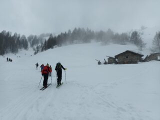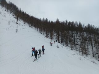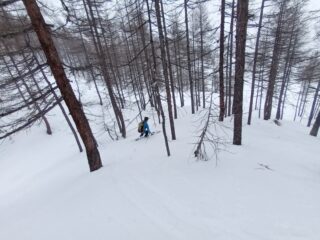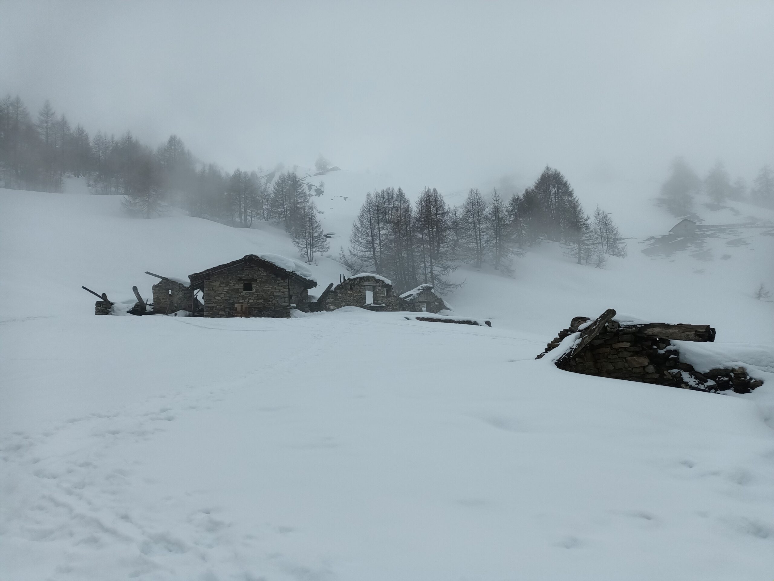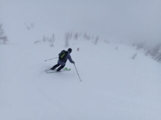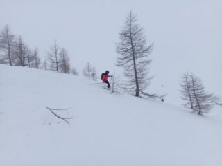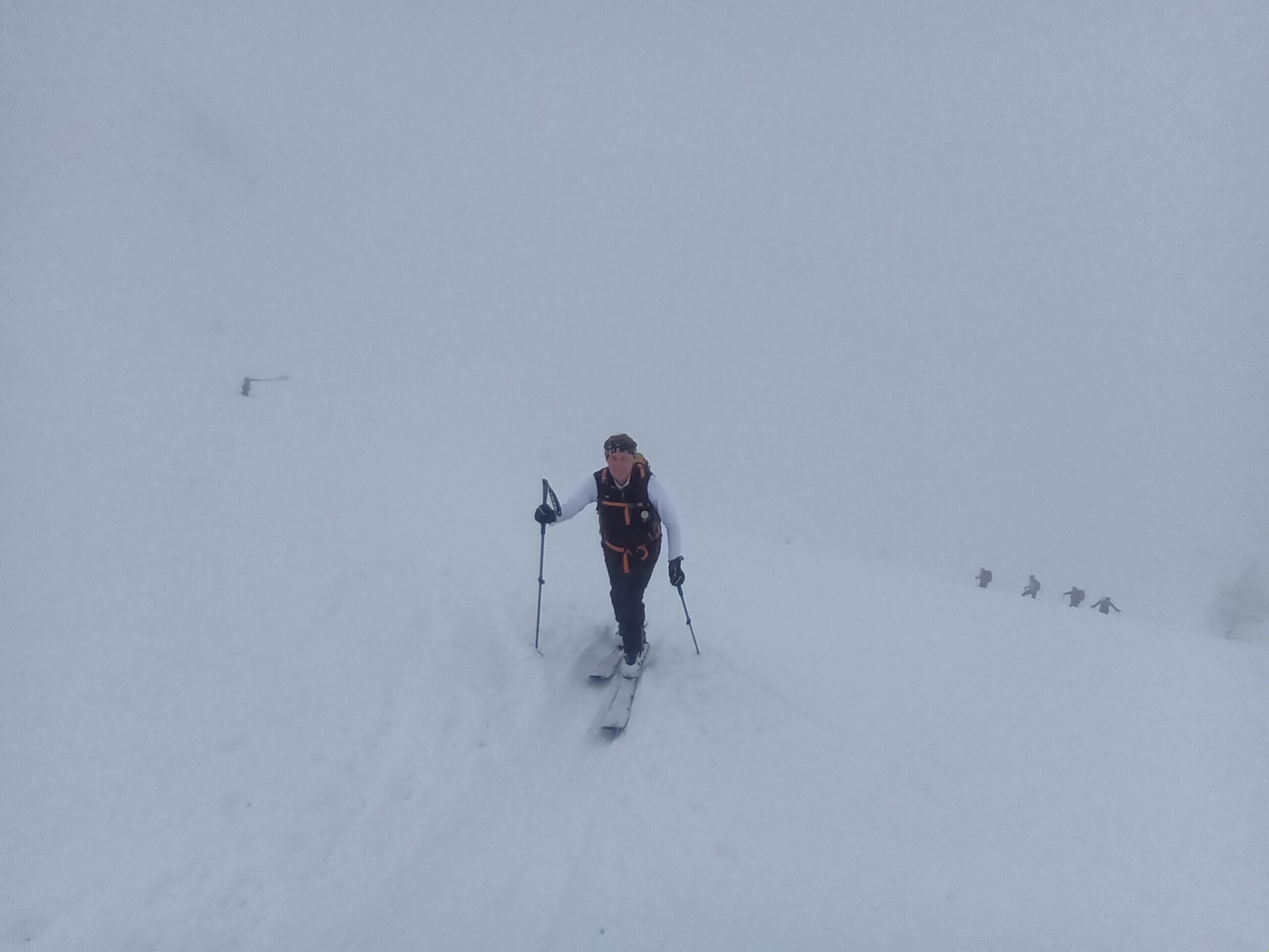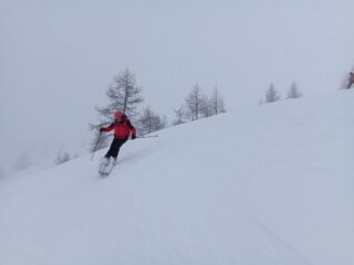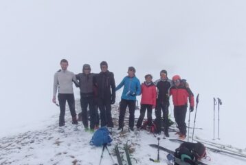 Meteo come da previsioni con nebbia e nevischio. Panorama nullo dal colle, leggermente spelato dal vento dei giorni precedenti. Innevamento comunque buono ma peccato per la visibilità molto scarsa che ha pregiudicato la prima metà della discesa. Buono invece il tratto nel bosco, sceso sotto una nevicata umida che ha depositato alcuni centimetri di fresca. Con Danilo, Vincenzo, Silvia, Alberto, Valter, Gianni e Luca.