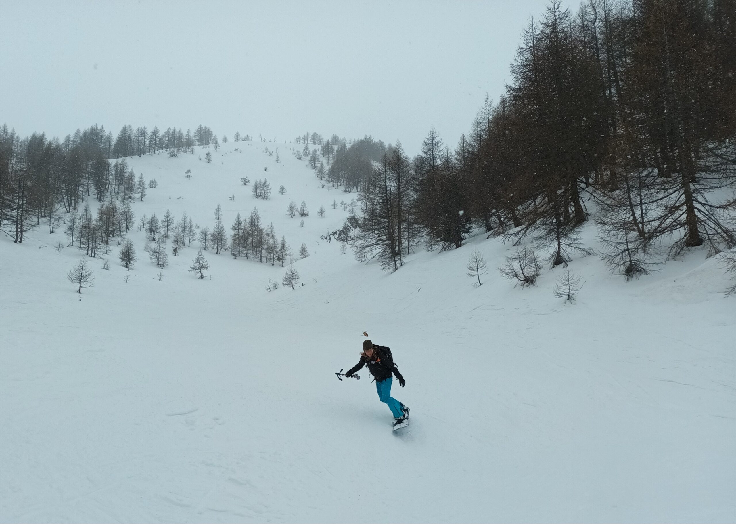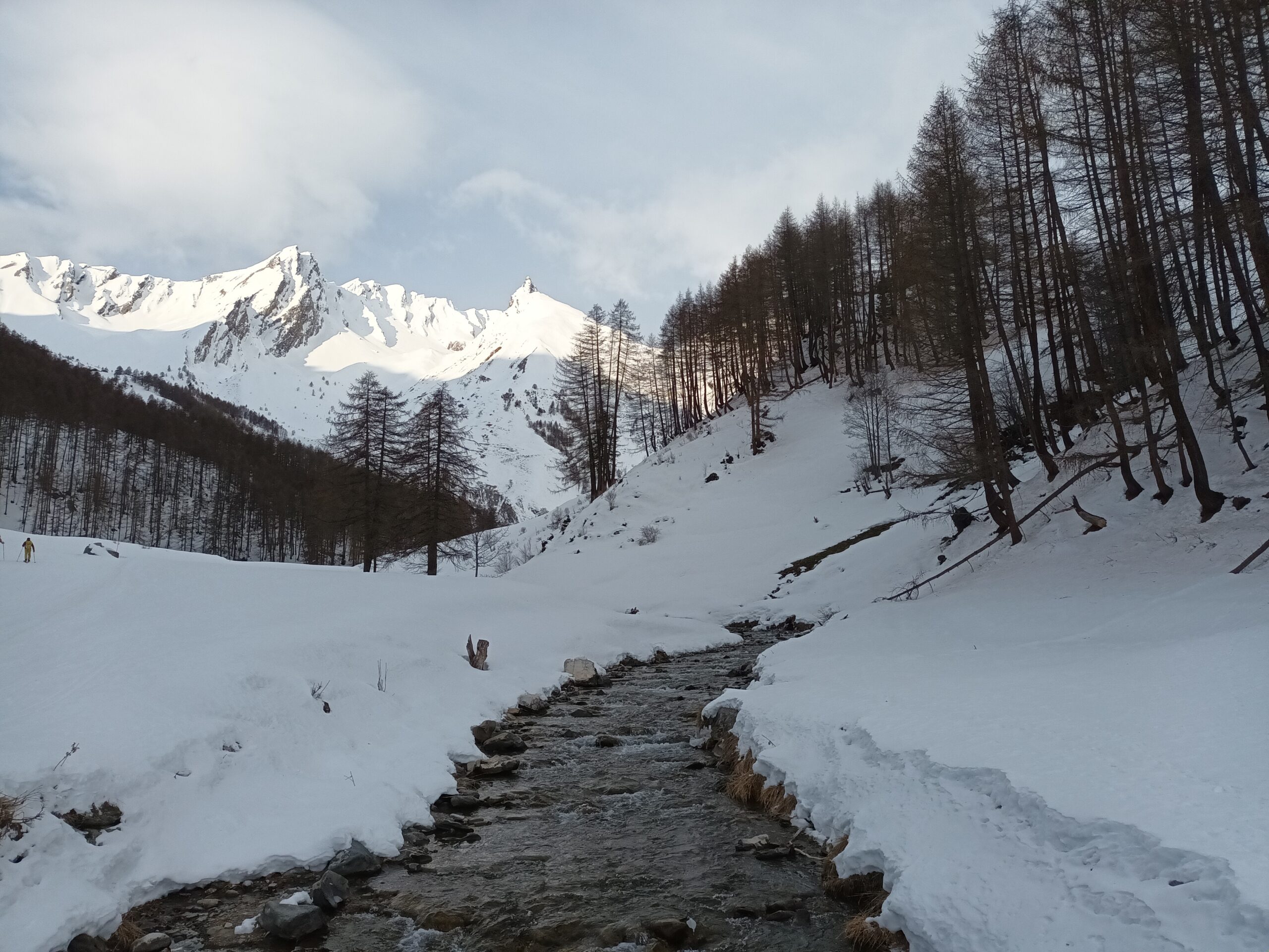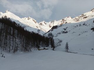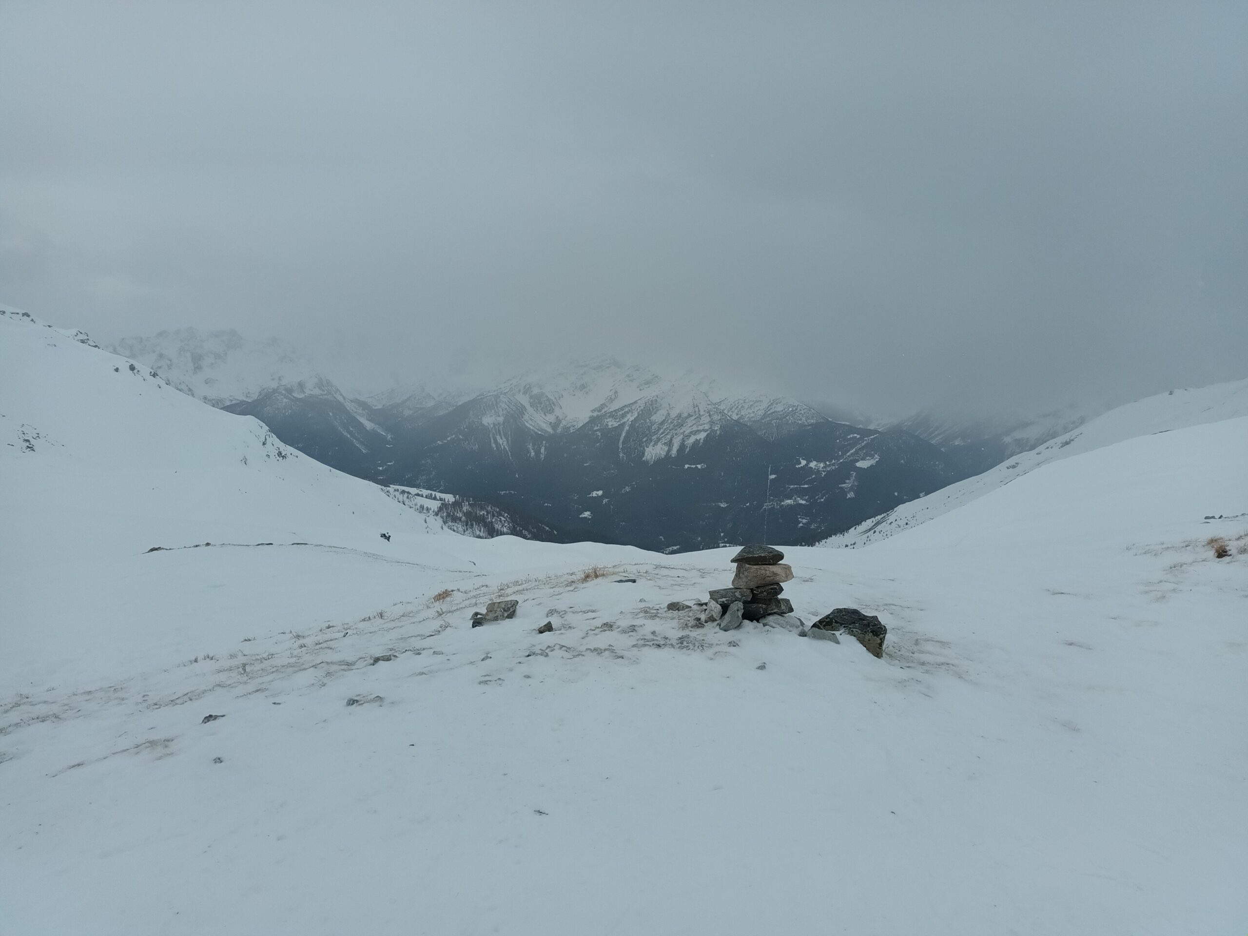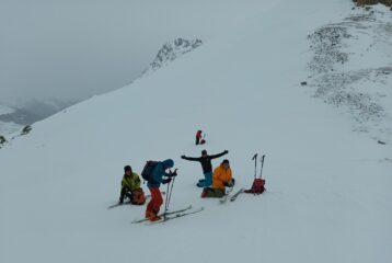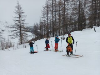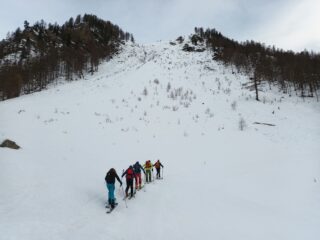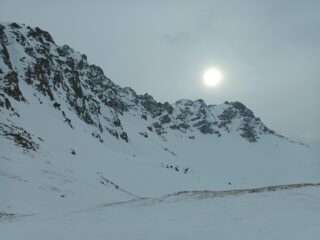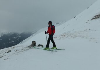 La perturbazione in arrivo ha anticipato le tempistiche previste e, poco dopo le 10, il cielo si è coperto con un leggero nevischio che ha depositato pochi centimetri di neve. Per arrivare al colle bisogna aggirare, da sinistra, una cornice potenzialmente insidiosa. Visibilità sufficiente in prospettiva panoramica ma problematica nella prima parte della discesa, condizionata a tratti dalla difficoltà di valutare bene le pendenze nonché le traccie gelate e preesistenti nel manto nevoso. Sciabilita migliore nel bosco con nevischio in aumento poi trasformatosi in leggera pioggia da quota 1.800 fino al piazzale di Crevacol. Con Danilo, Federica, Antonio, Luciano e Giorgio.