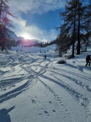 Vento non forte ma fastidioso. Neve lavorata dai numerosi passaggi con alcune parti intonse nel bosco