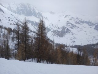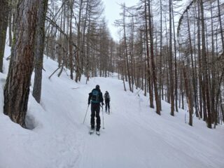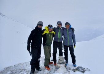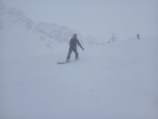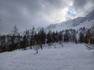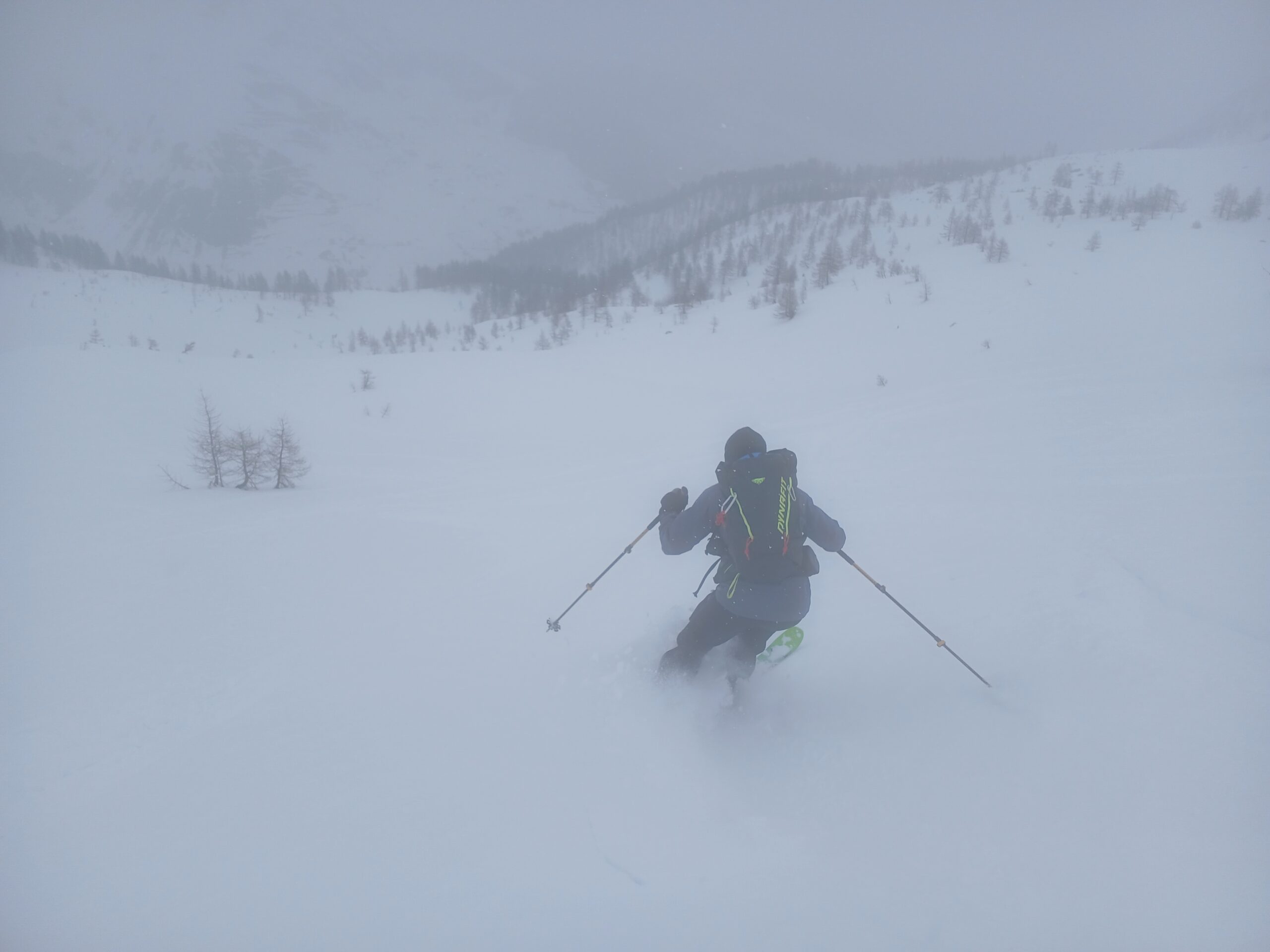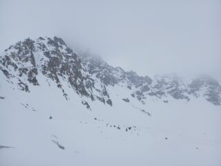 Partiti sotto un leggero nevischio poi trasformatosi in una lieve nevicata che ha depositato pochi centimetri alle quote più elevate. Percorso ovviamente tracciatissimo e parecchi scialpinisti in giro. Poco vento al colle con visibilità in diminuzione che ha condizionato la prima parte della discesa, su neve polverosa anche se non leggerissima. Migliore la situazione nel bosco, soprattutto nei tratti più ripidi ancora intonsi in quanto siamo stati tra i primi a scendere. Nonostante il meteo, avverso ma non troppo, una bella e classica gita in compagnia di Vincenzo, Danilo e Alessio.
