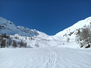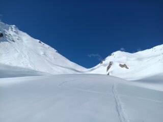 Pochi passaggi e gran parte della discesa su neve intonsa e ottima.