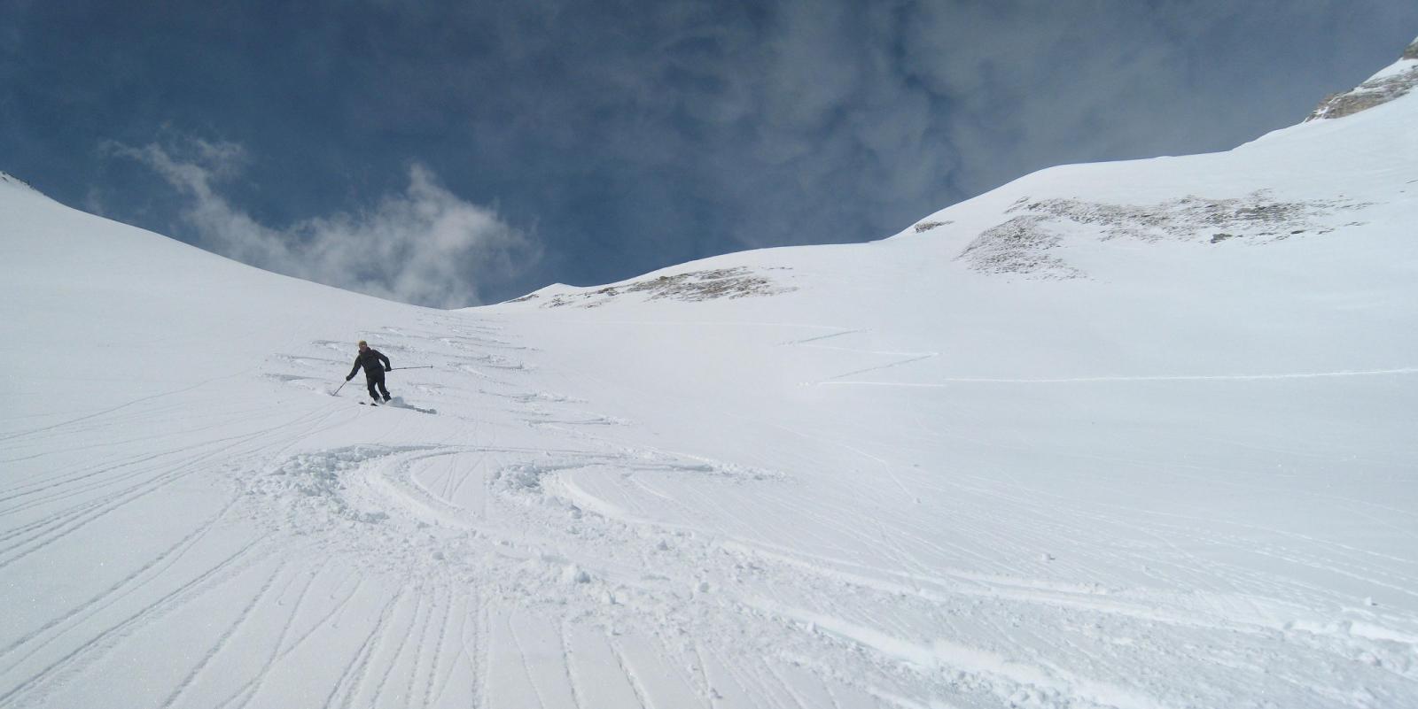Quando abbiamo lasciato il tracciato per il colle per salire alla q. 2709 abbiamo subito pensato a un errore madornale: la neve si stava scaldando velocemente mentre a nord era bella farinosa e asciutta. Nonostante la traccia discutibile (se non vi piace basta che ne fate un’altra) arriviamo in cima poco dopo le 11, subito seguiti da due del posto, e scendendo vediamo che la neve non è per niente malvagia cercando l’esposizione migliore. Ci sono 10-20 cm di fresca su fondo compatto. Rientrati nel canale che va al colle proseguiamo dritti verso la via di salita per il Corleans, dove la farina era bella asciutta e con giusto un paio di tracce di discesa. Un pezzo di strada e poi giù a picco nel pratone di By. Praticamente tutta bella, salvo la valangona alla partenza con tutta la ramaglia sopra.