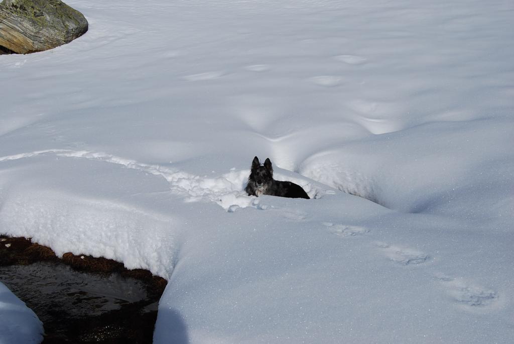 E poi naturalmente con Frank al seguito. Sceso un po’ cotto ieri dal Bertone, stamattina si pensava continuasse a dormire, invece puntuale era già sulla porta pronto a partire. Grande gita anche per lui, anche perché ormai ha capito come ci si comporta in neve fresca quando si sprofonda: basta ricorrere al battipista …..