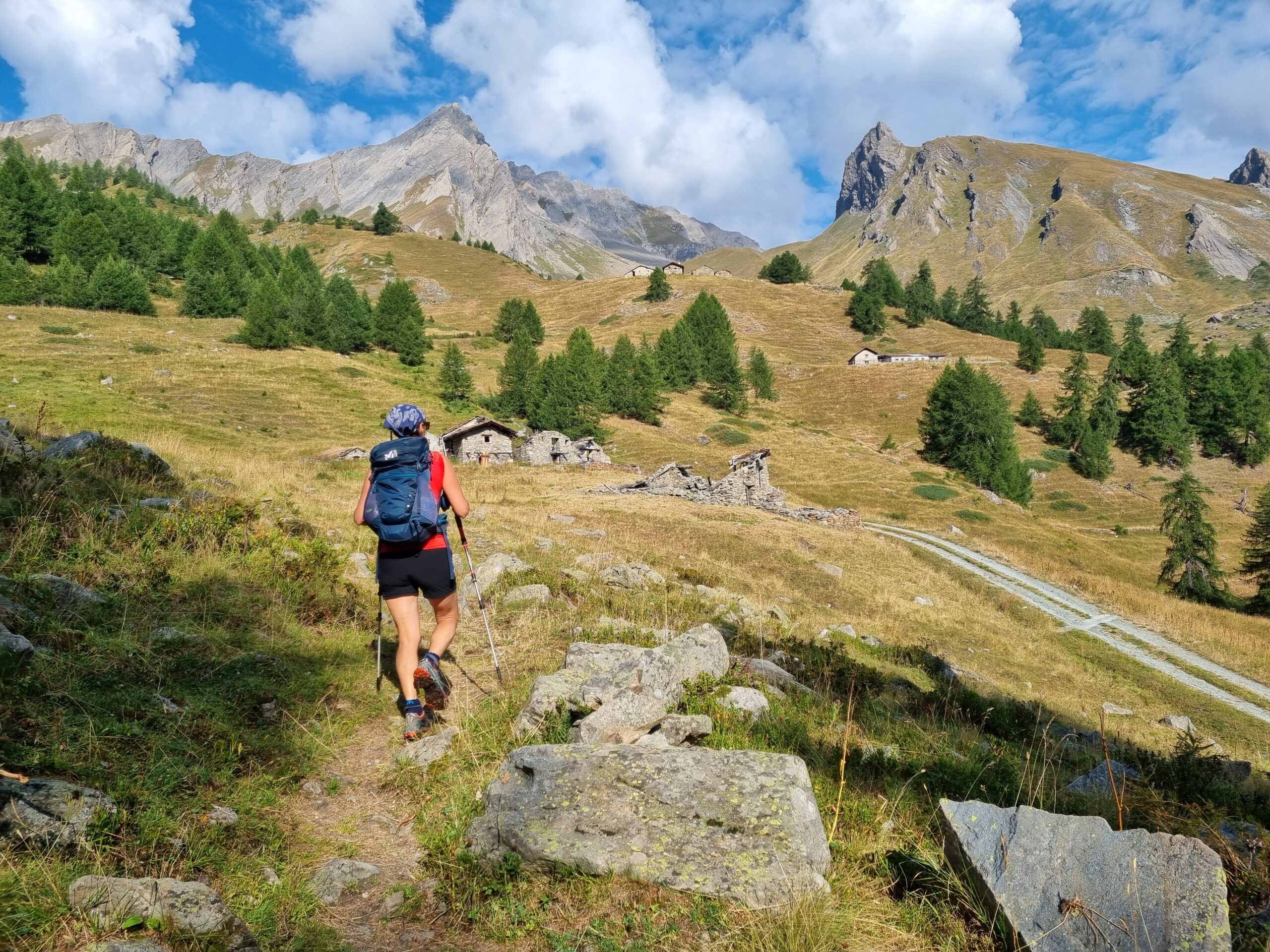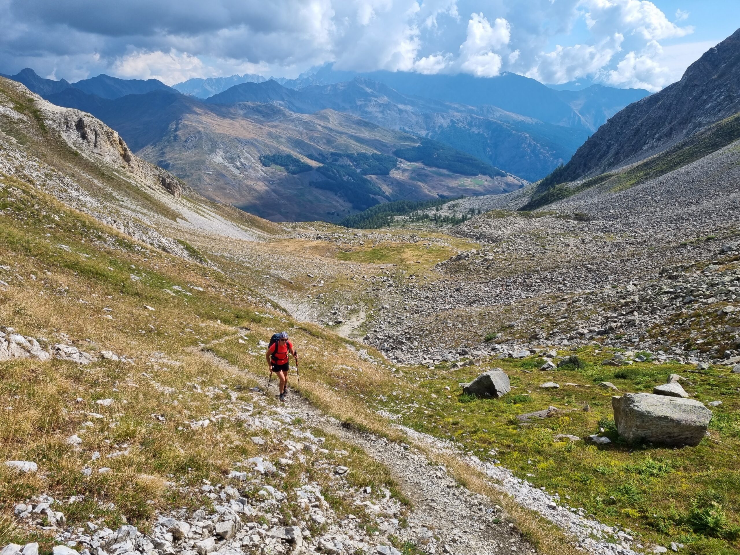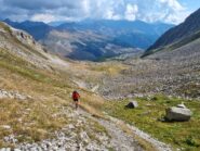Si prosegue nell’ampio vallone, prima lungo aridi pascoli e successivamente su terreno pietroso sino a raggiungere il colle, da dove si allarga improvvisamente il panorama sulle montagne circostanti.