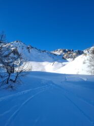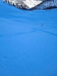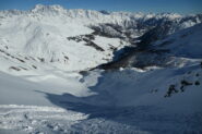 Si entra così in un ampio vallone poco ripido che si percorre quasi completamente, verso il termine è necessario risalire con attenzione un tratto ripido sulla sinistra sino a raggiungere una piccola conca.