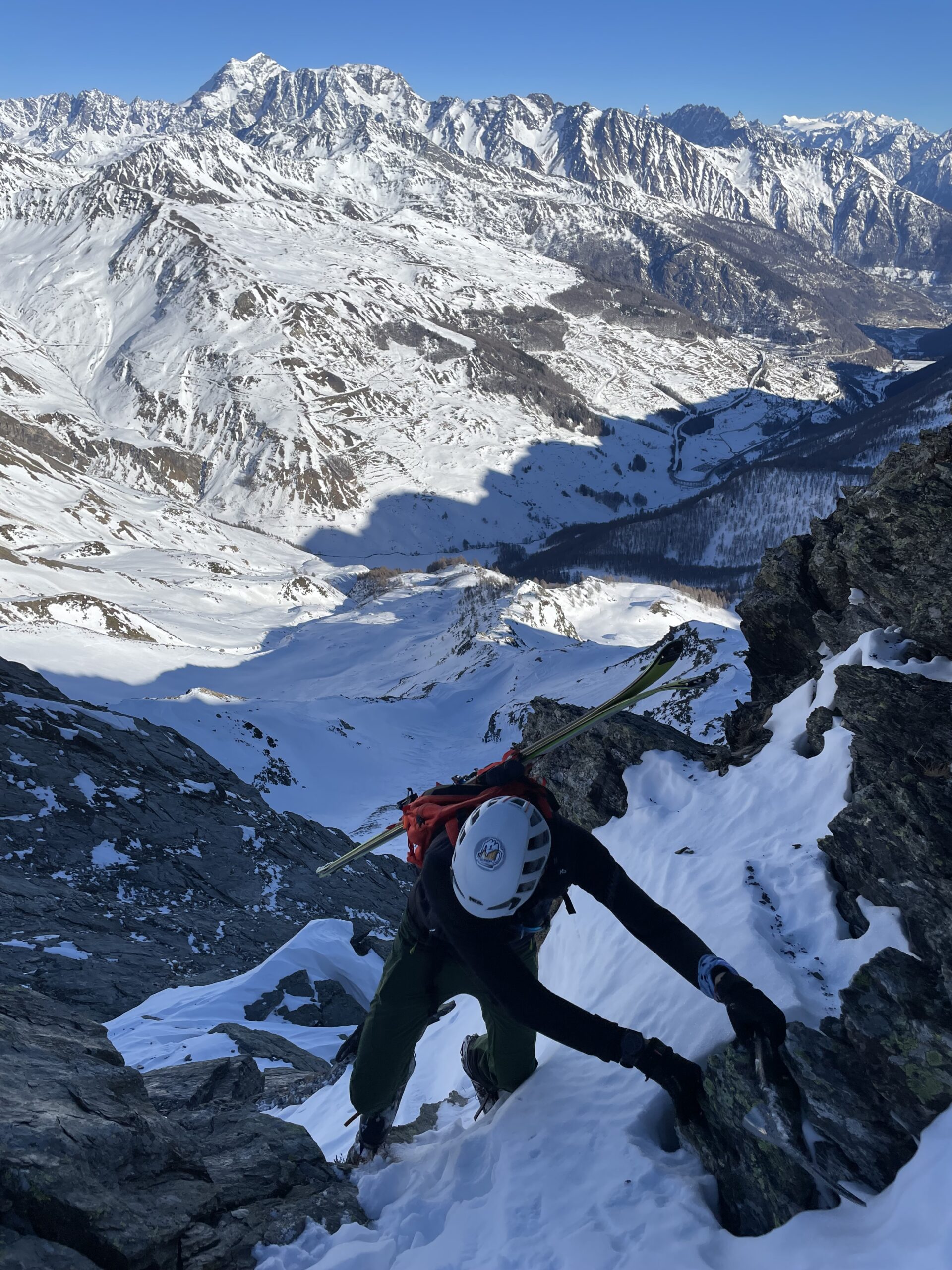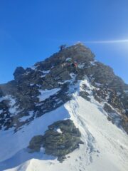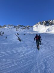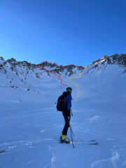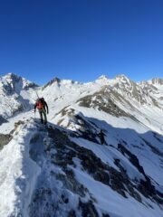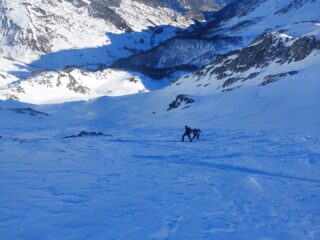 Seguito traccia esistente, ben battuta fino in cima ed evidente. Siamo saliti in direzione canale centrale e poi traversato in cresta fino a riprendere il canale nord per la discesa, che ha neve decisamente migliore rispetto al centrale. In salita non usato né ramponi né coltelli, per traversata obbligatori ramponi e piccozza perché ci sono alcuni salti da aggirare tramite canalini nevosi (neve ben assestata, ottima tenuta, ma passaggi decisamente esposti). Allego traccia per chi volesse ripetere. Neve in discesa crostosa nella parte iniziale del canale, dopo molla progressivamente diventando ottima e molto divertente. In basso invece quasi una pista dove ci si ricollega per la traccia al colle