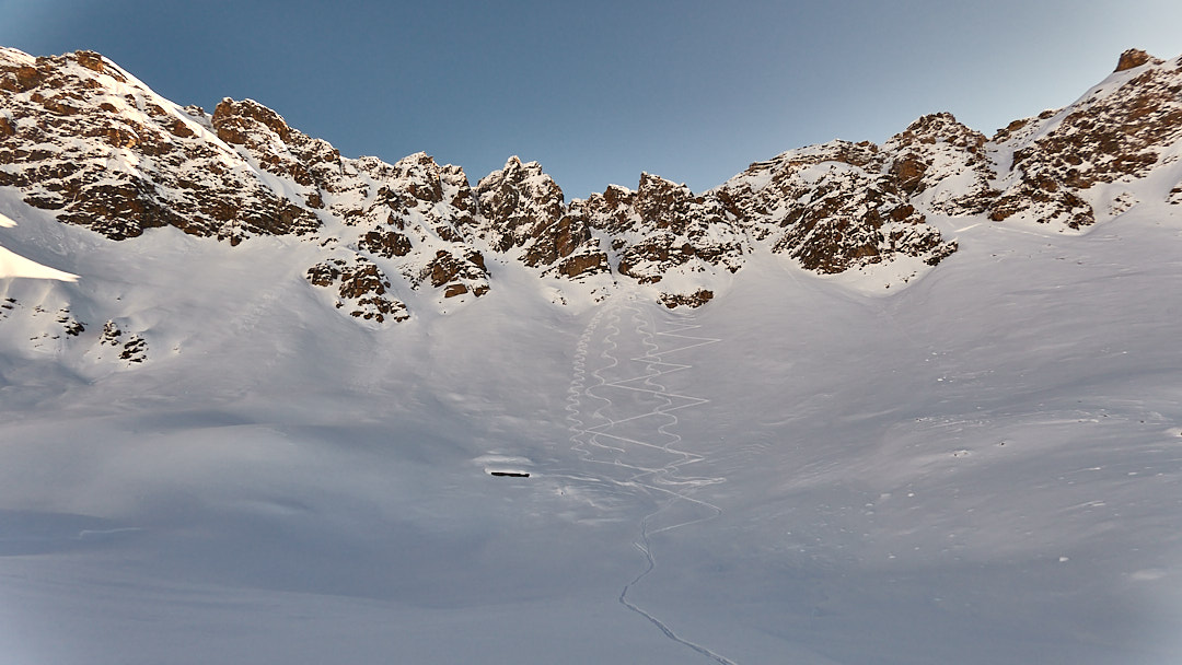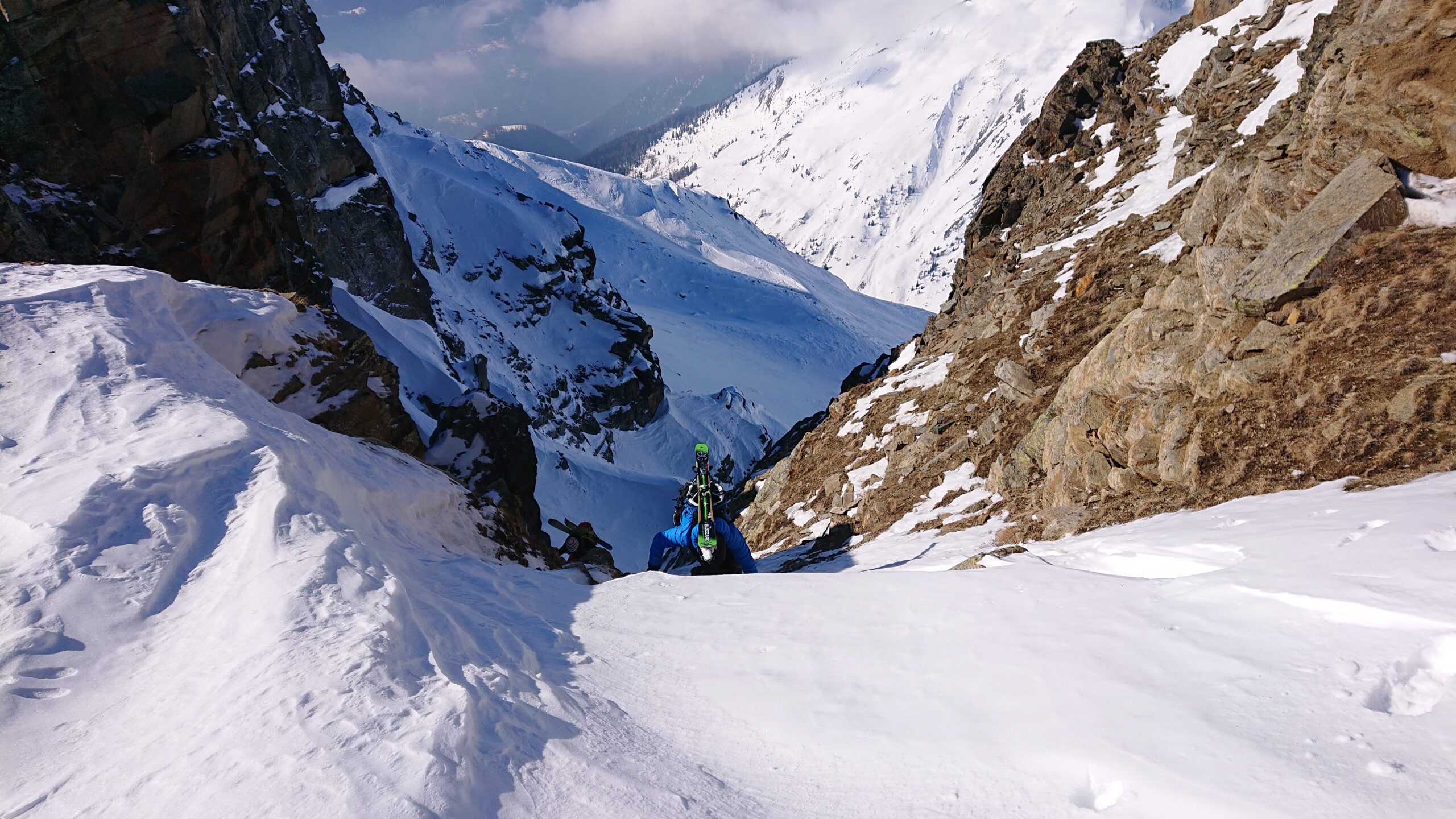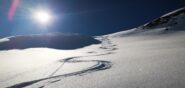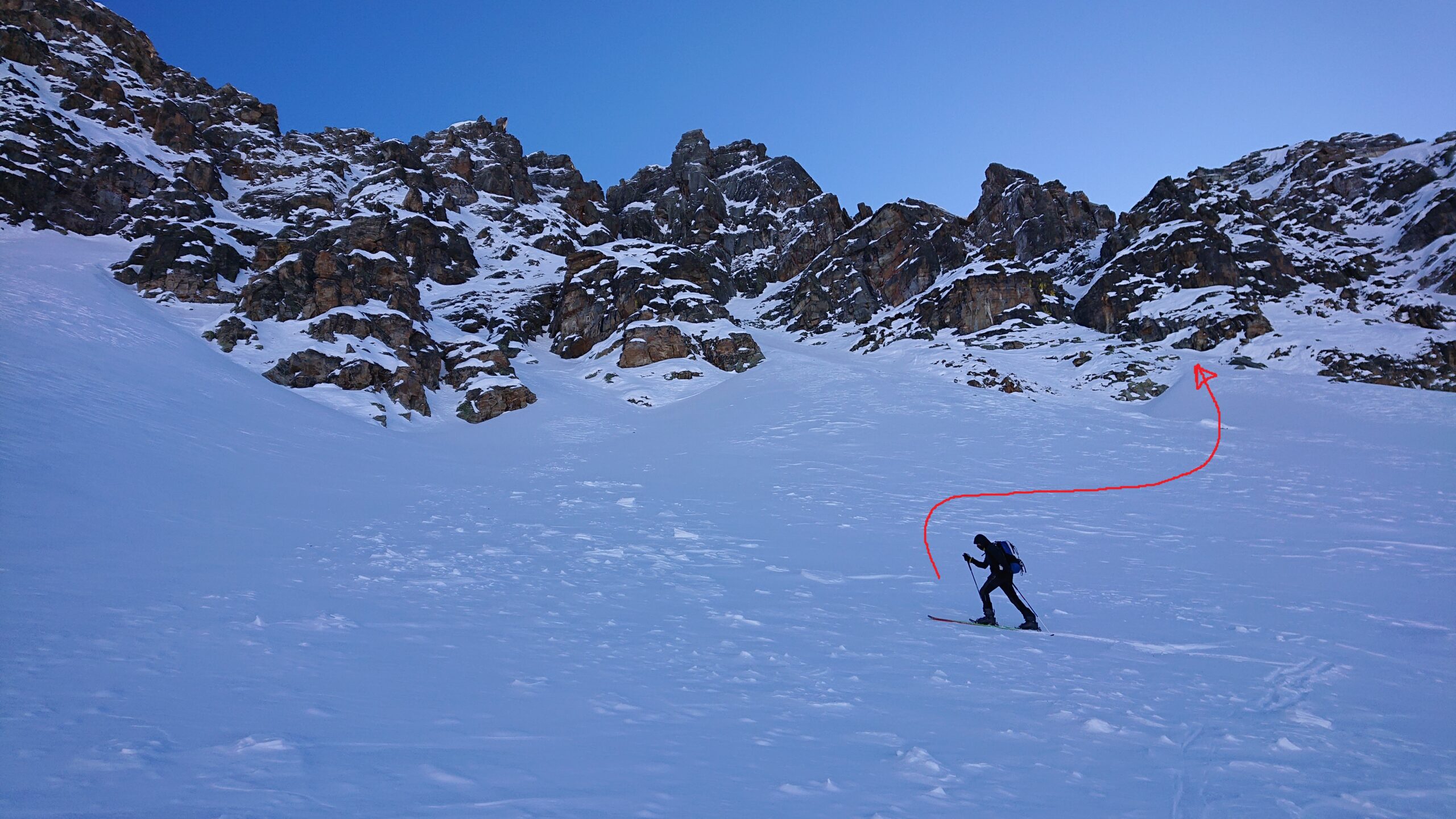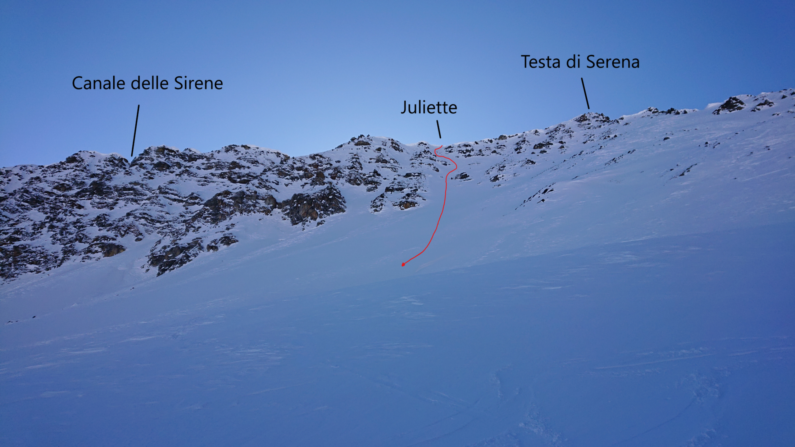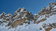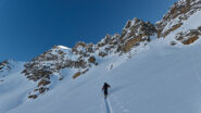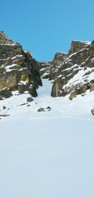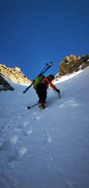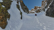 Terminato il canale si possono calzare nuovamente gli sci per raggiungere la vicinissima Testa di Serena o la Testa dei Fra.