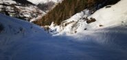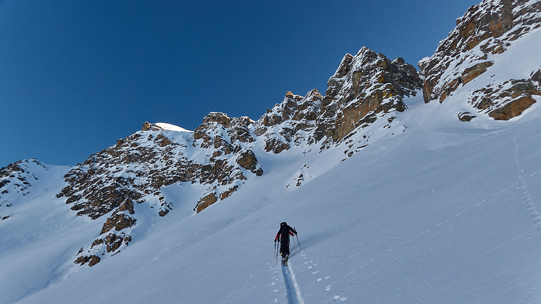 Da Planaval seguire la strada poderale che con un paio di svolte, prende quota in direzione del col Serena. Attenzione, questo tratto è molto valangoso. Si supera un alpeggio e si affronta un tratto più ripido ed incassato prima di sbucare nel pianoro che precede il col Serena. Sbucando in vista del colle, si lascia la traccia principale e ci si dirige verso la bastionata rocciosa alla propria dx. Il canale rimane un po’ nascosto. Per trovarlo può risultare comodo prendere a riferimento un grosso roccione colorato di giallo che ne delimita l’ingresso (il canale sale a dx del roccione).