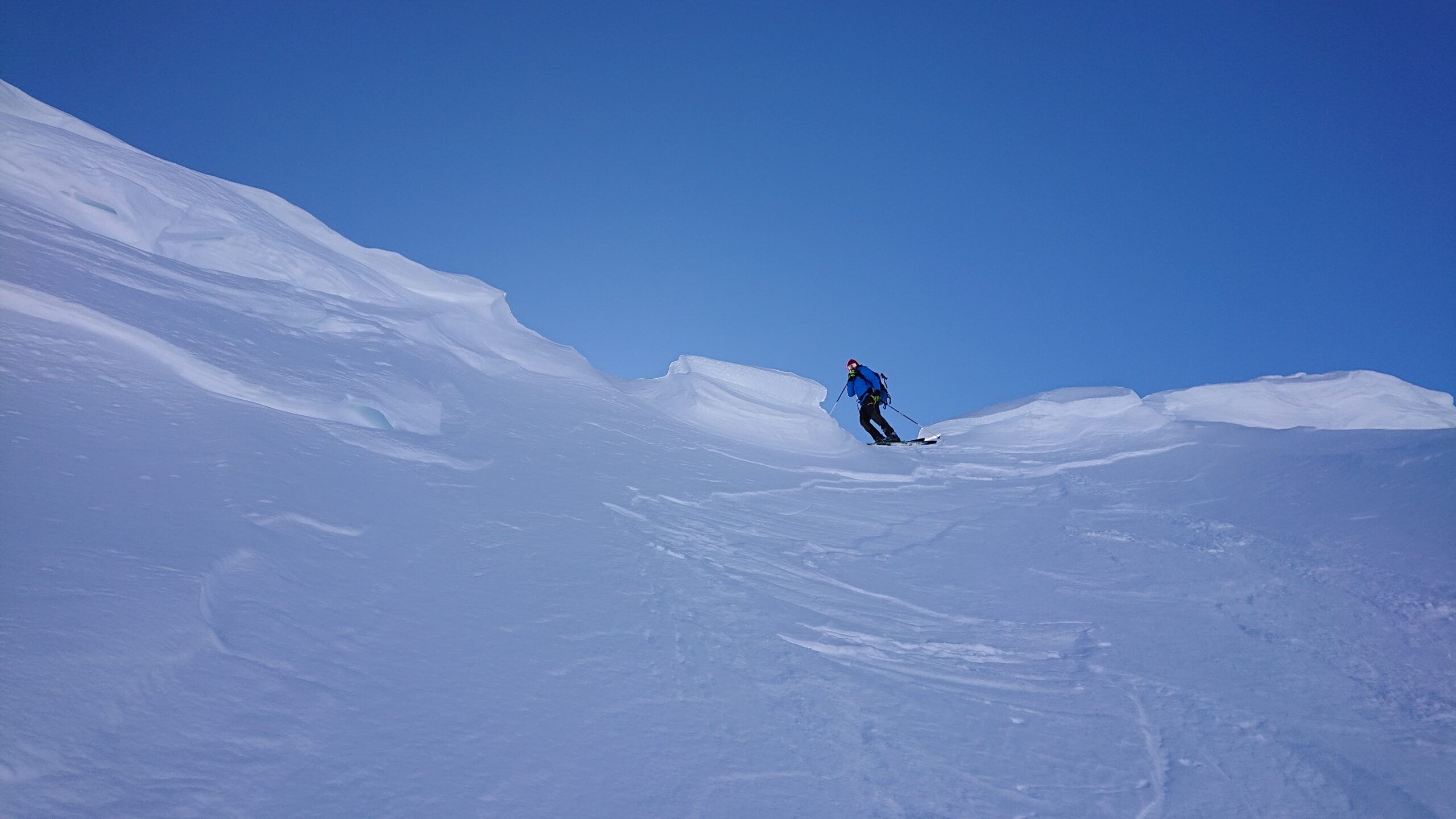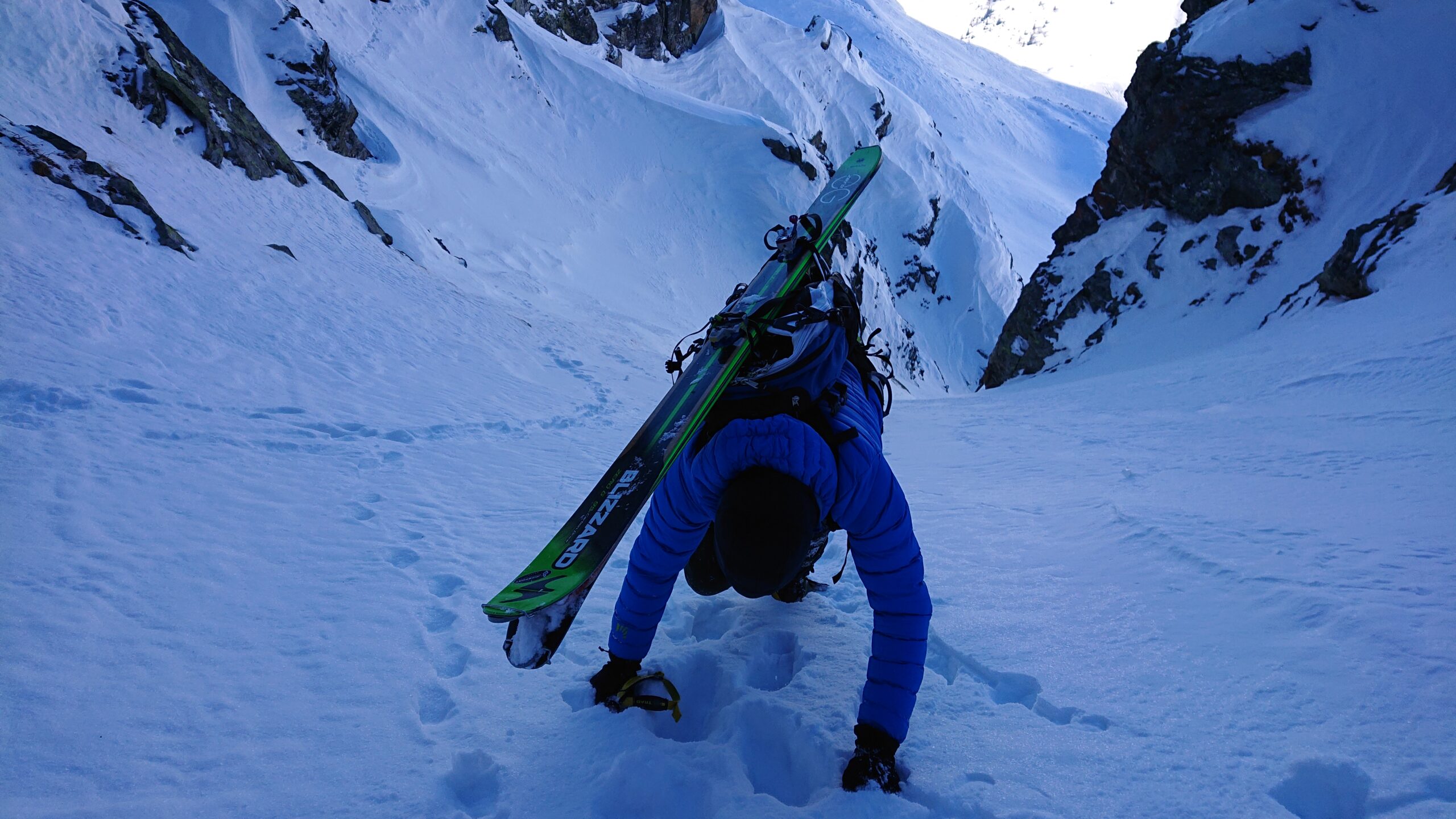 Seguito itinerario per il colle Serena sino al colle dove abbiamo trovato finalmente il sole, -14 alla partenza e salita senza soste per il troppo gelo. Poi traverso sotto la parete ovest della Testa di Serena alla ricerca dell’ingresso del canale, che è quello meno evidente. Molto utile il riferimento sulla destra della pietra gialla, aggiungo traccia per facilitare il compito. Mettiamo subito i ramponi in basso sul conoide, neve dura con tre cm di farina che fanno scivolare troppo gli sci. Individuata la roccia gialla siamo sicuri del canale. Neve a tratti durissima dove si sale spediti, a tratti placche che si rompono sotto i piedi e si sfonda annaspando un po’. Pochi metri sotto l’uscita, tratto senza neve da salire su roccette, un po’ di misto, direi passi di I° e finalmente si ritorna al sole. Visto che la neve era dura saliti a piedi sino in vetta della Testa di Serena seguendo la facile cresta. Discesa sul pendio nord seguendo una nuova linea battezzata Juliette, che si trova un pelo spostata sulla sinistra rispetto alla verticale della vetta guardando dal basso. Aggiungo foto per capire meglio. Discesa molto carina su neve dura con 4/5 cm di farina che permetteva una simpatica sciata. Poi sul percorso super tracciato del colle Serena.