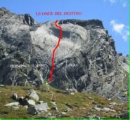 Si punta in obliquo a sinistra verso l'evidente placconata salendo al culmine della conoide di erba e pietre. 1h50/2h. Attacca alcuni metri a destra di Qui non c’è il mare.