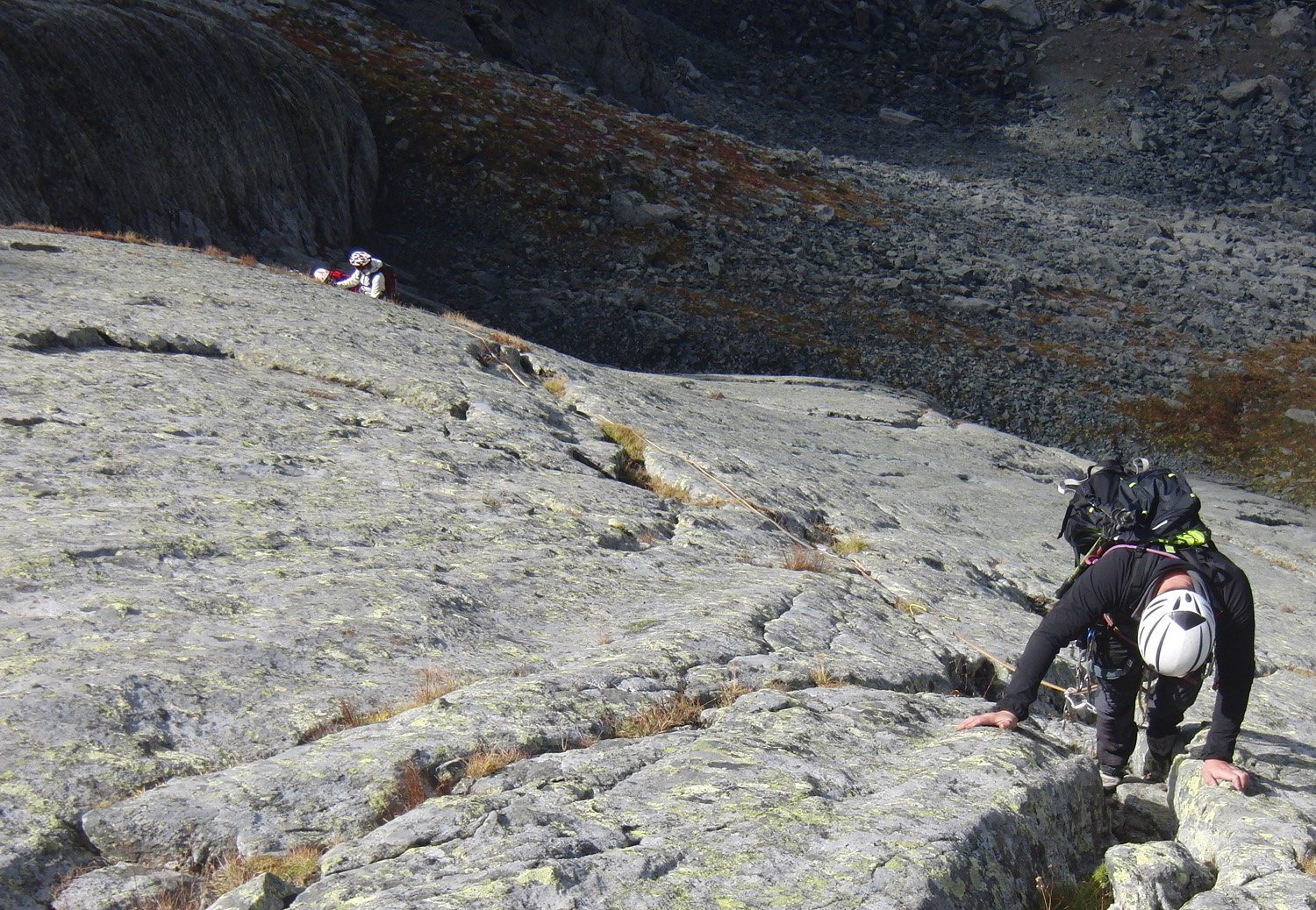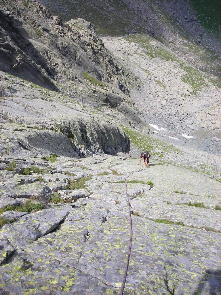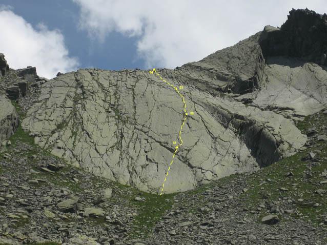 Si abbandona il sentiero e ci si porta, dopo un ripido versante erboso, su una piatta distesa di grossi massi. La si attraversa facendo un pò di attenzione fino ad arrivare alla base di un pendio ripidissimo di sfasciumi ed erba che, dopo averlo risalito, ci porta all'attacco della via situata nel punto più basso della placconata.