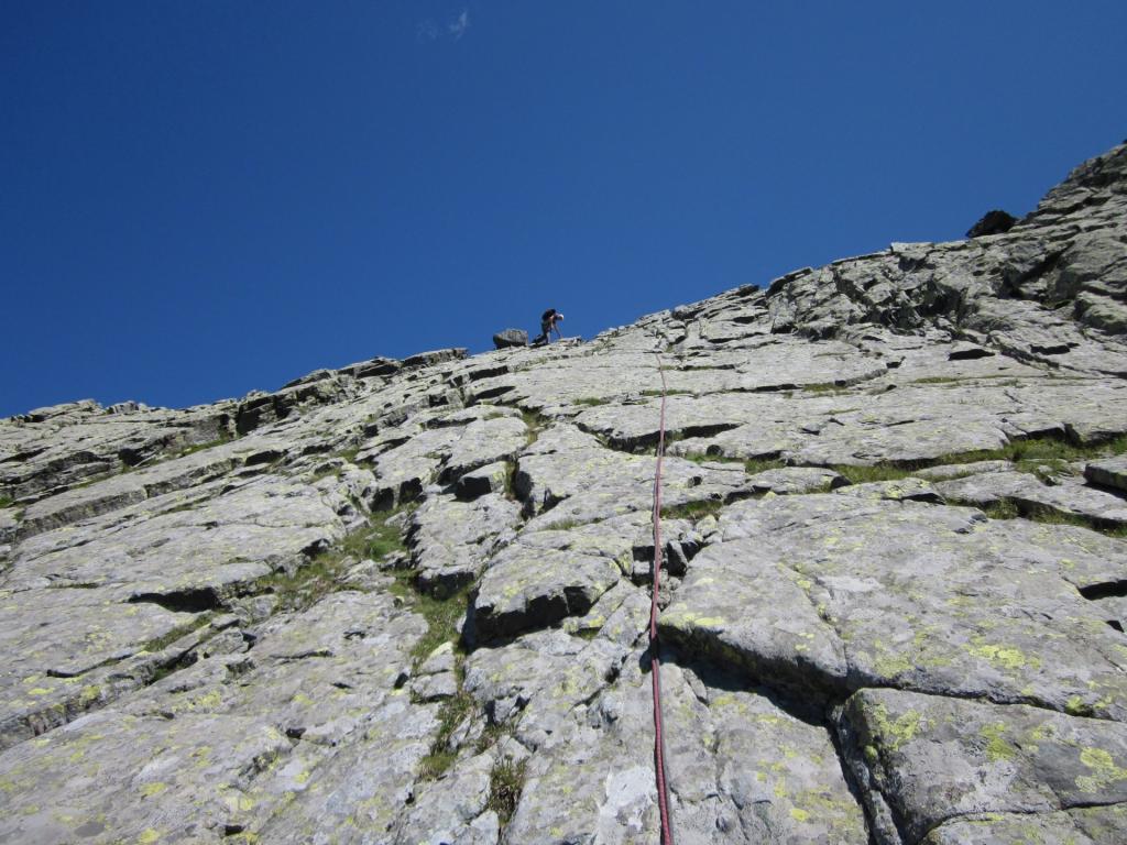 Dalla cresta, piegare a sx e costeggiando il filo per tracce su teppe erbose raggiunge la croce di vetta, altrimenti seguire il filo roccioso fino all’anticima (30 m, III).