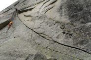 attaccare per una serie di lame quindi seguire il fessurino diagonale per le mani sfruttando con i piedi i pochi appoggi disponibili. Quindi scalare il diedrino finale.