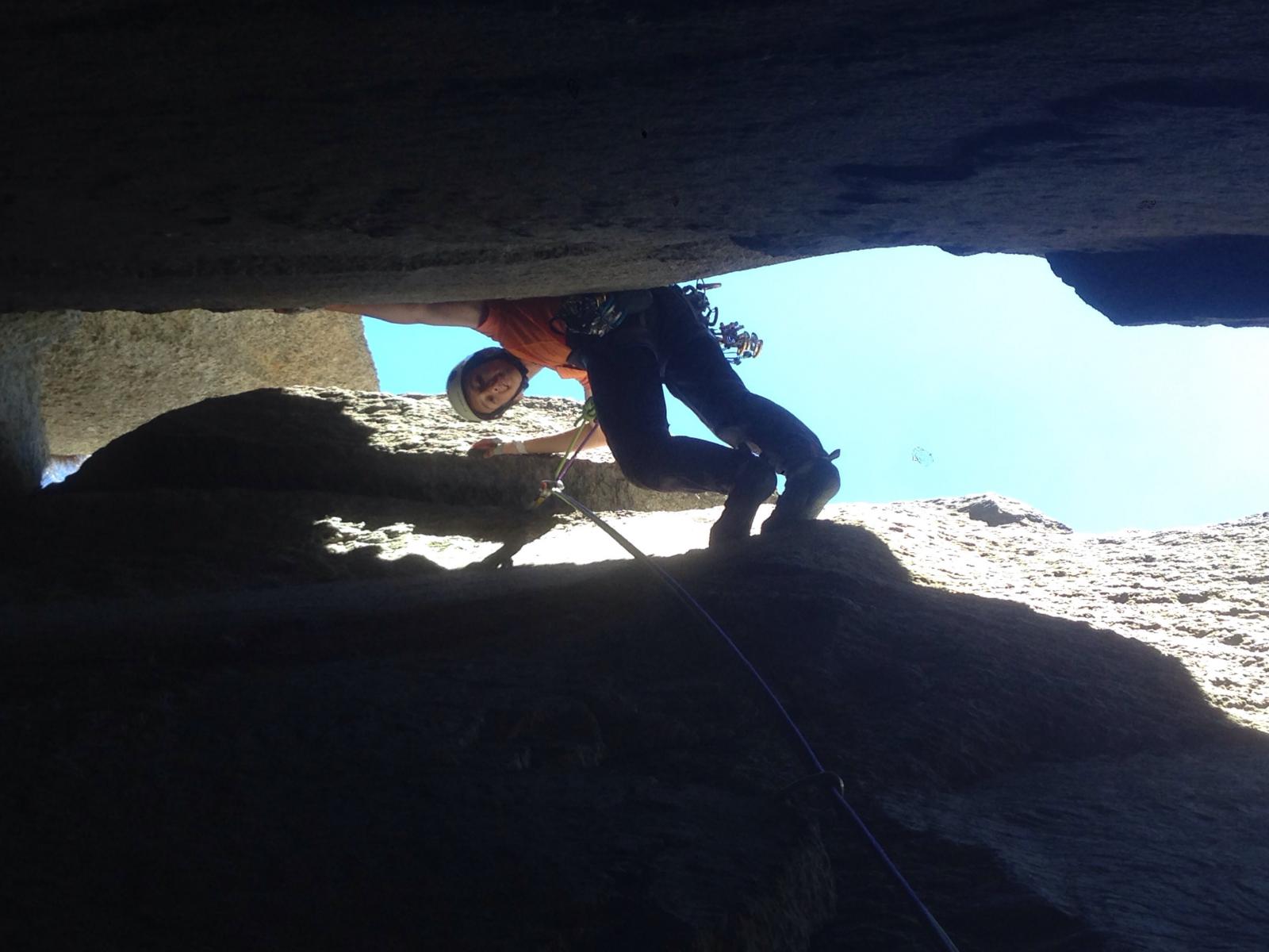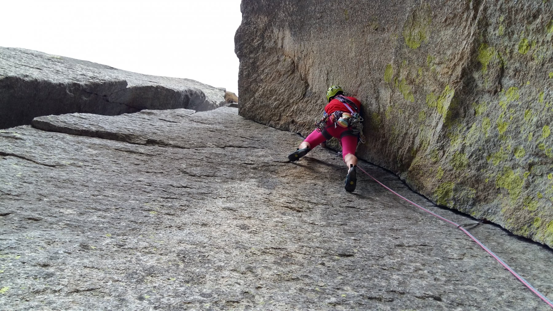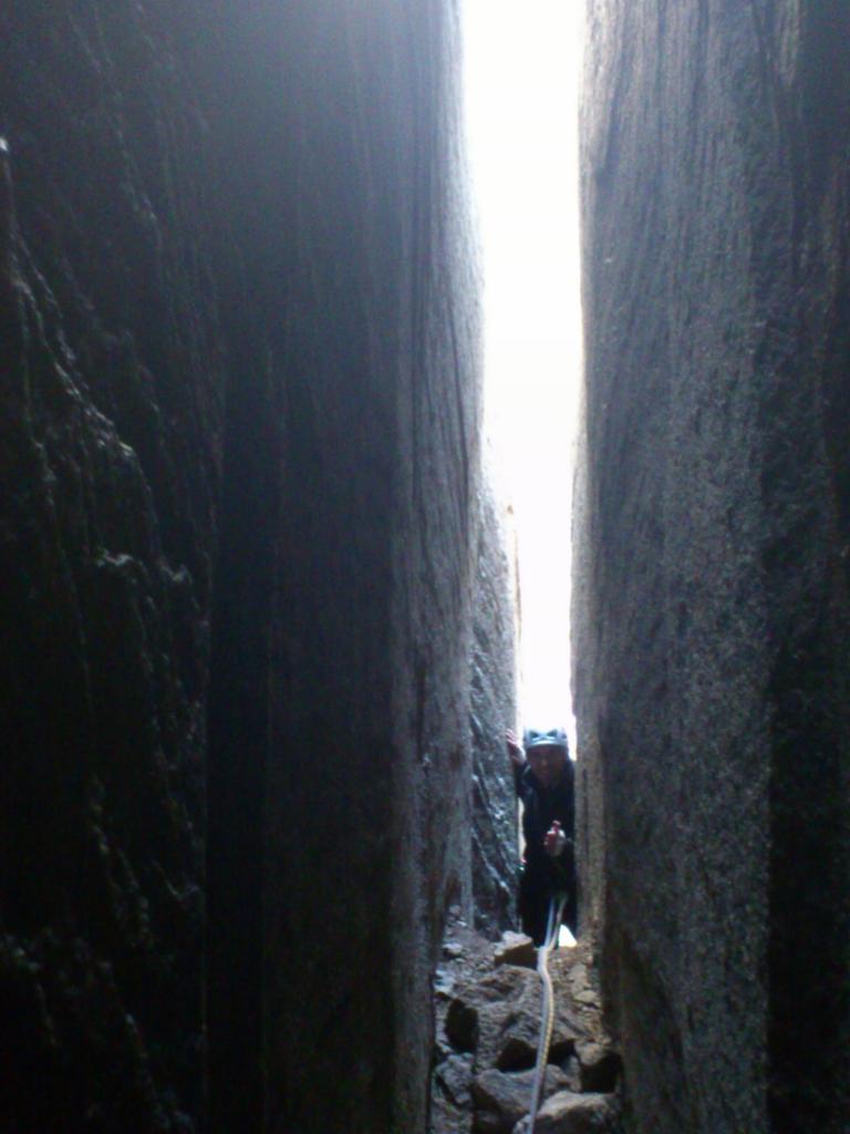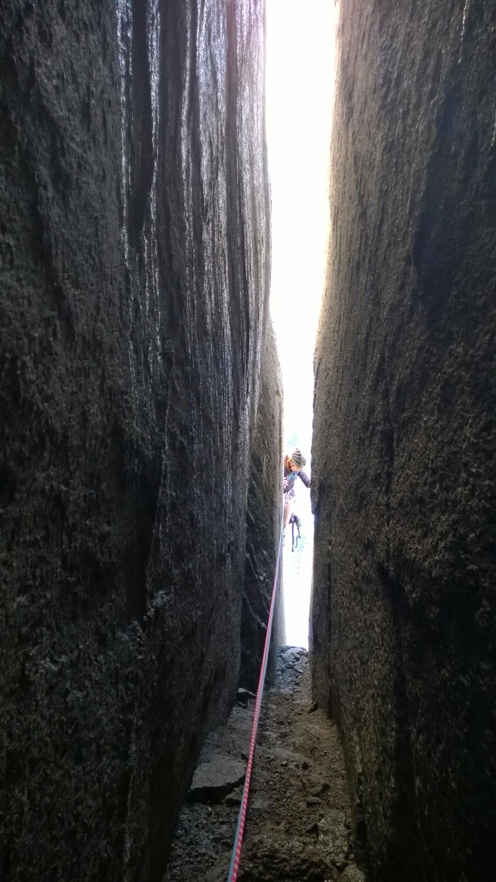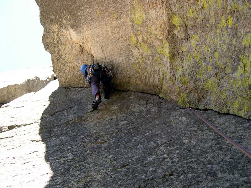 a) – Rinviarsi alla sosta e traversare a sinistra in placca (5a) sino a entrare nel camino. Camminare sul fondo sino a raggiungere alcuni massi incastrati dove si sosta.